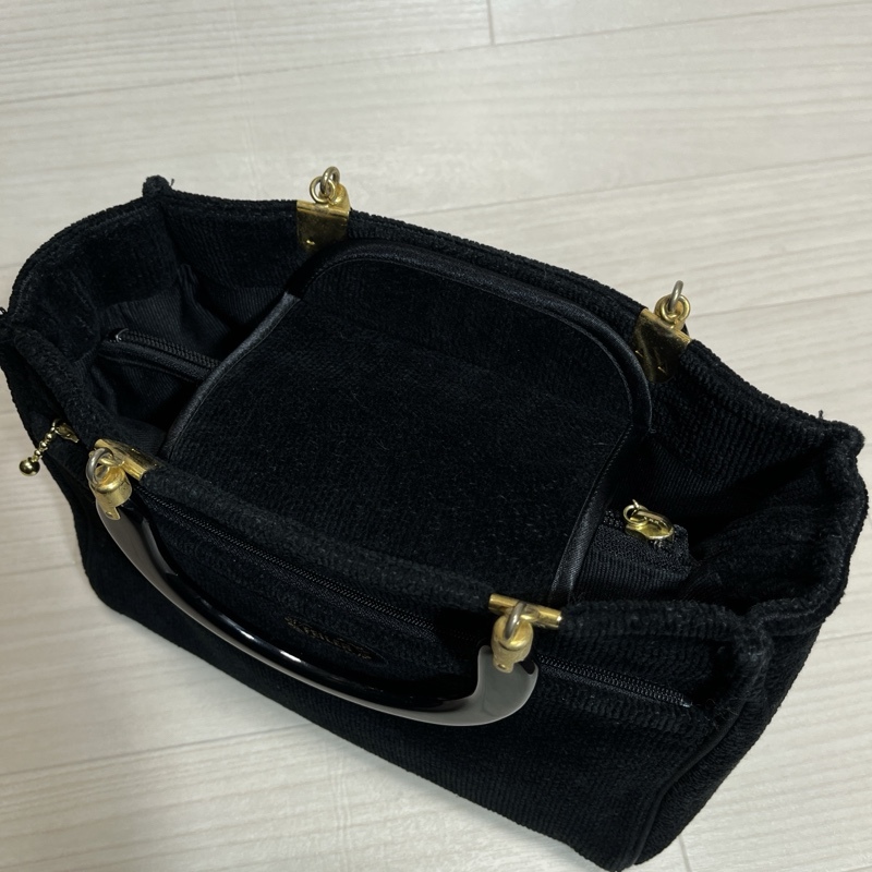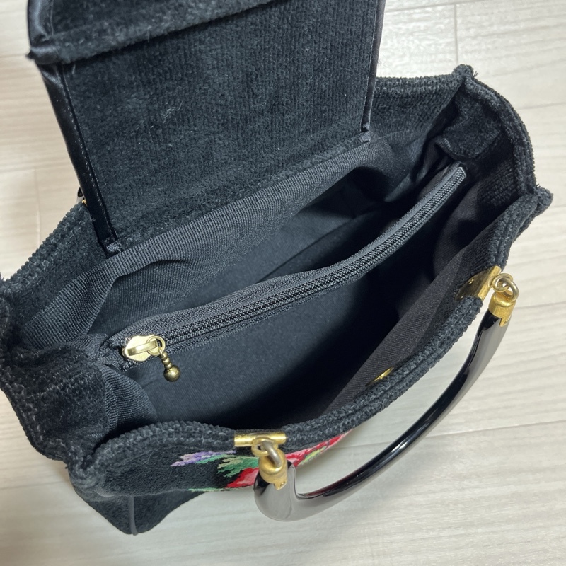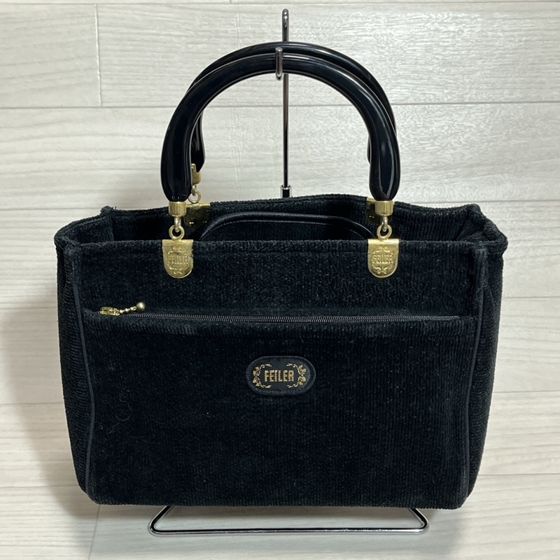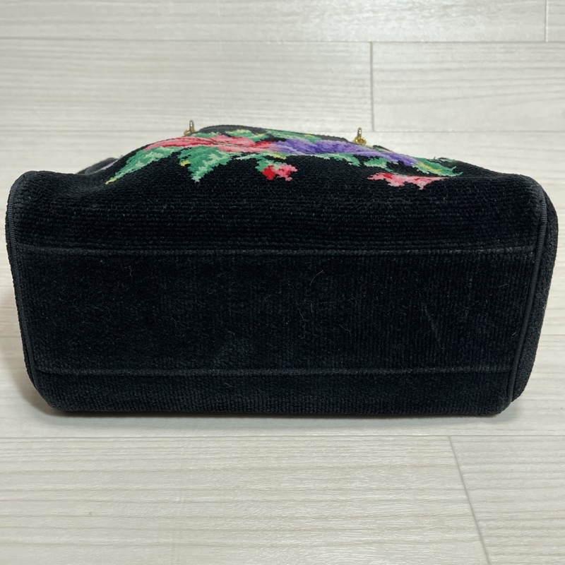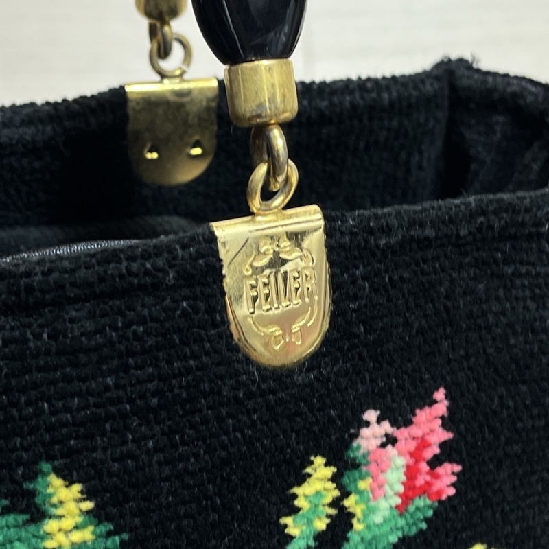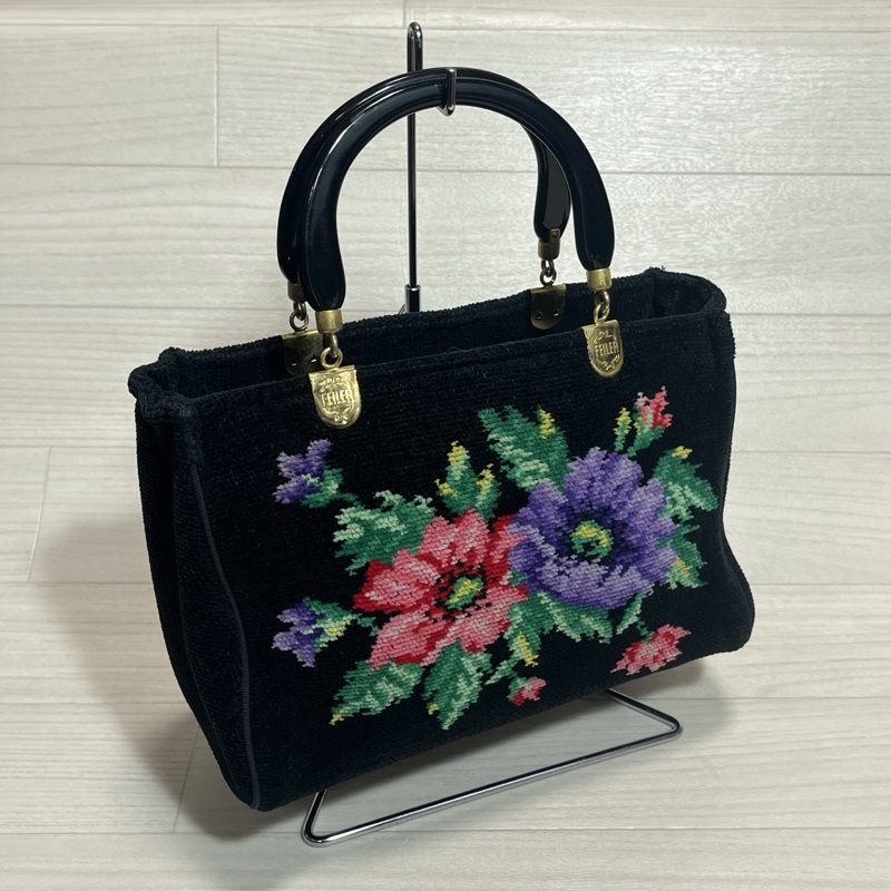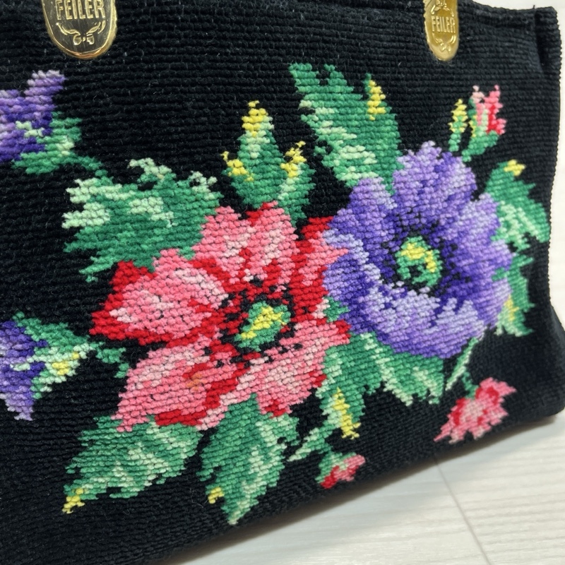 ●FEILER/フェイラー/シュニール織り/フラワーハンドバッグ/ブラック/ゴールド金具/トートバッグ/内側中央仕切りポケット付き/