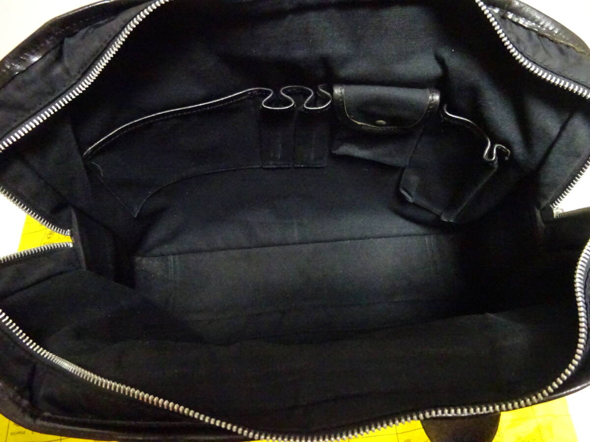 【ポケット】表ファスナーポケット1つ、裏オープンポケット2つ。上部ファスナー開閉式。内部1部屋(仕切りポケット2つ、スナップフラップポケット1つ、スナップポケット1つ、ペン入れ2つ)