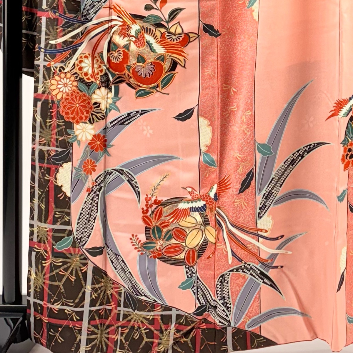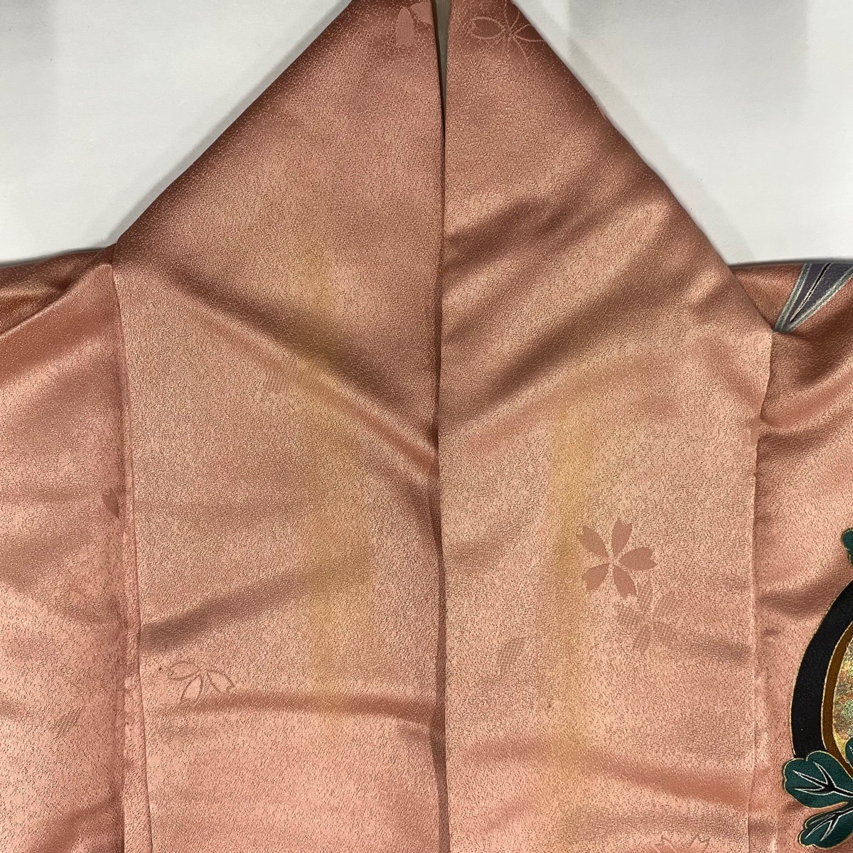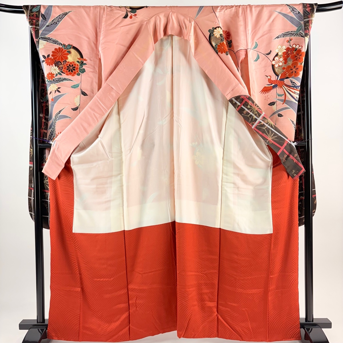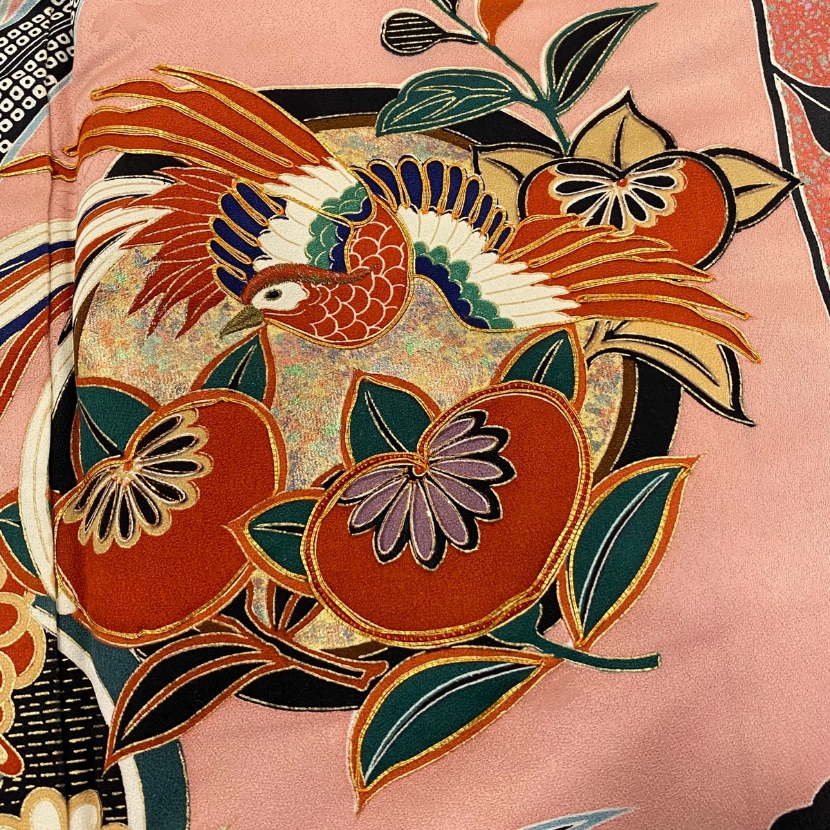 振袖 名品 尾長鳥 橘 金糸 金彩 ピンクベージュ 袷 身丈165.5 裄丈71 L 正絹 【中古】 |