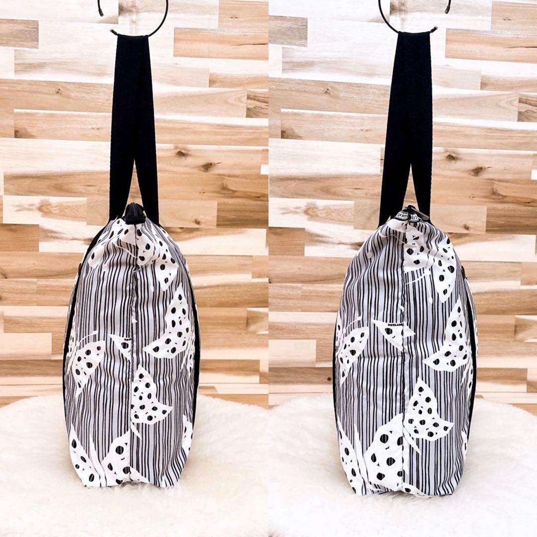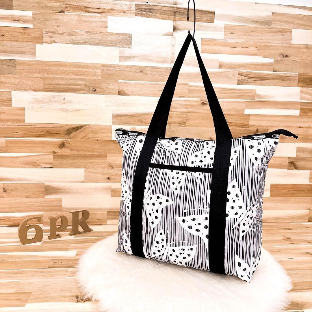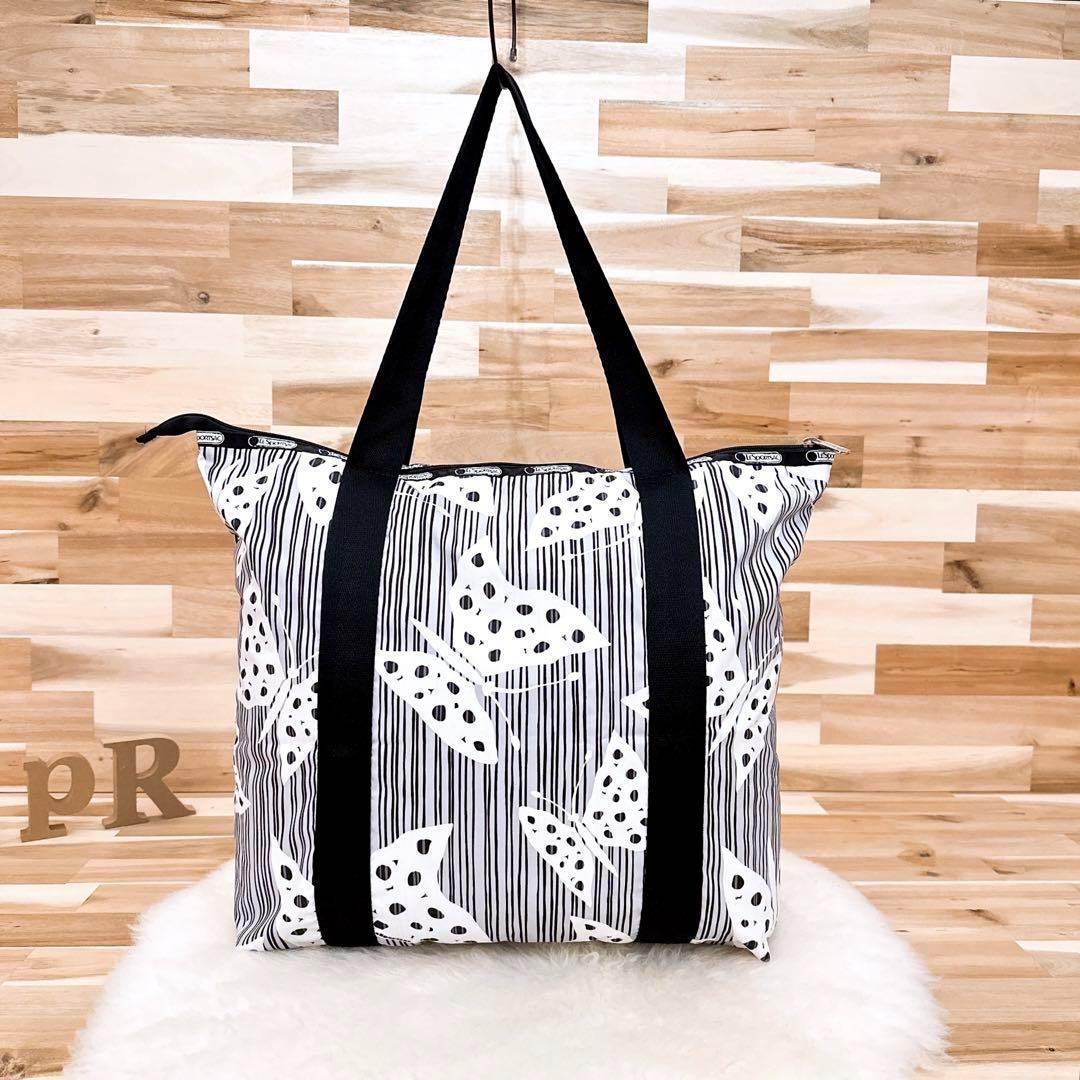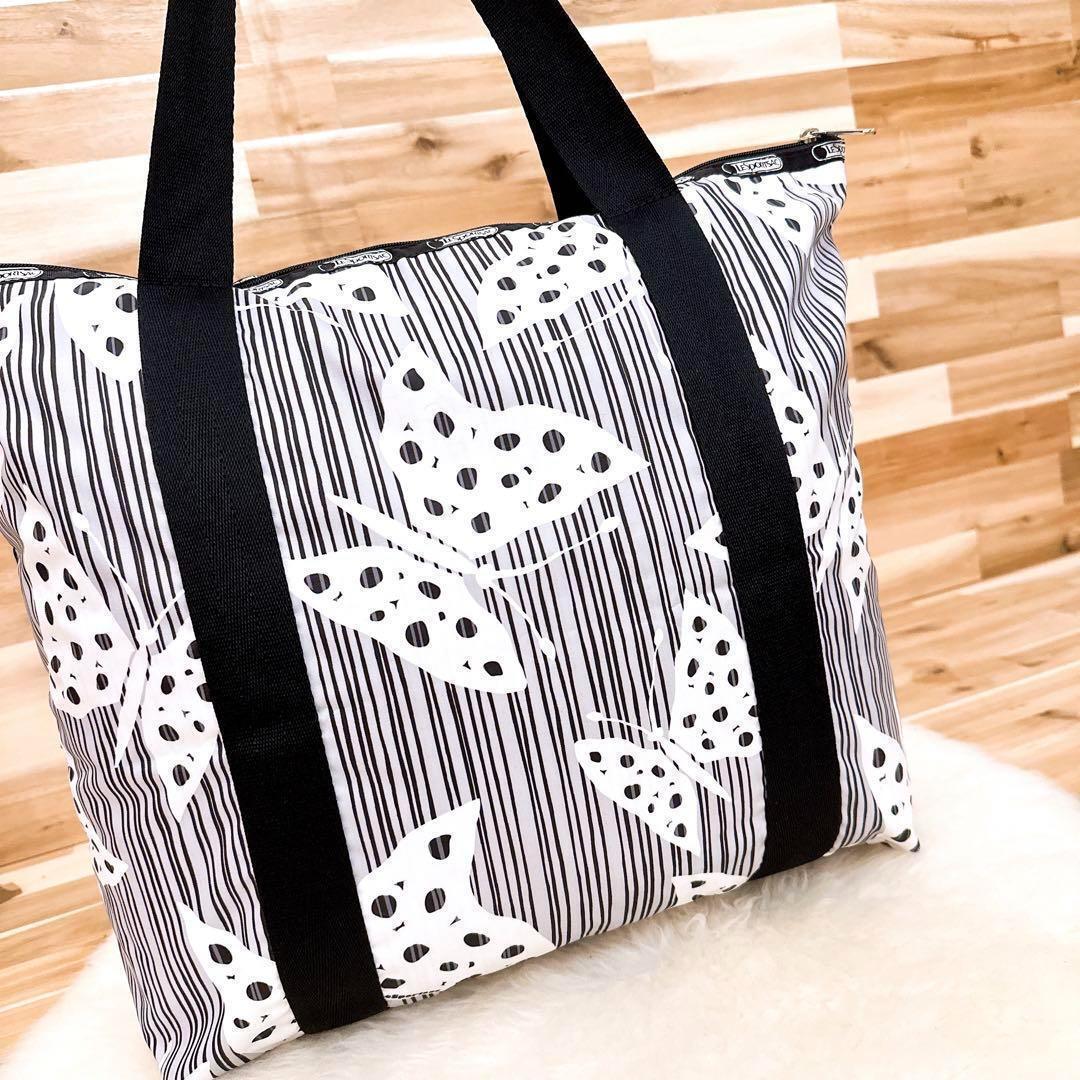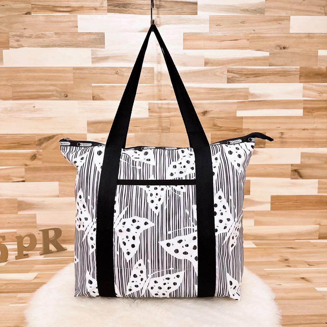 * 蝶 *グラフィカルに舞うバタフライと不規則に並んだストライプの組み合わせが視線を惹きつけるデザイン。荷物をしっかり入れても持ち重りしにくい軽量な素材×程よいサイズ感。外と内のポケット付きで整理整頓もしやすく、モノトーンベースで季節を問わず活躍する、使いやすさも魅力のLeSportsacのトートバッグです。