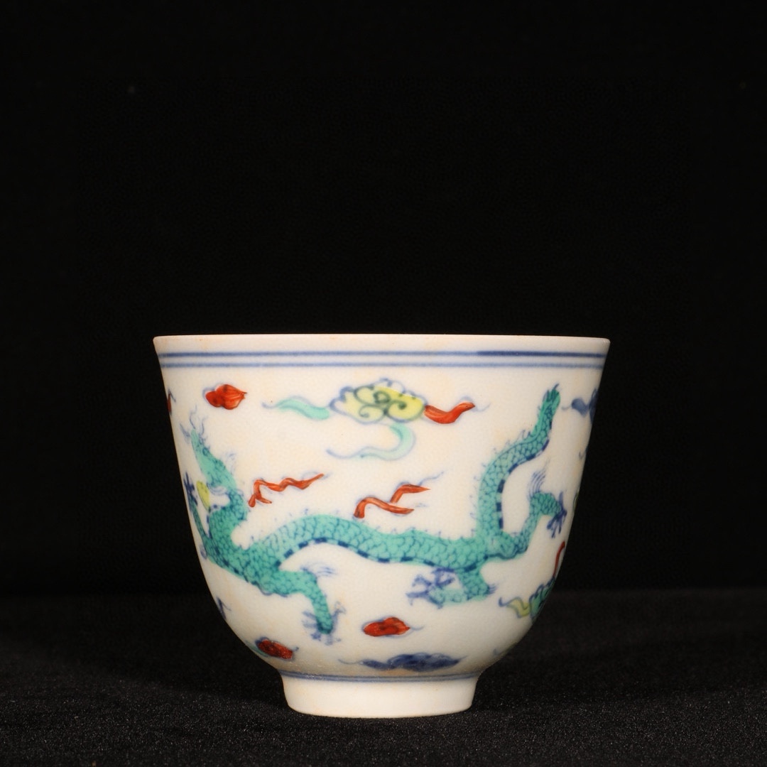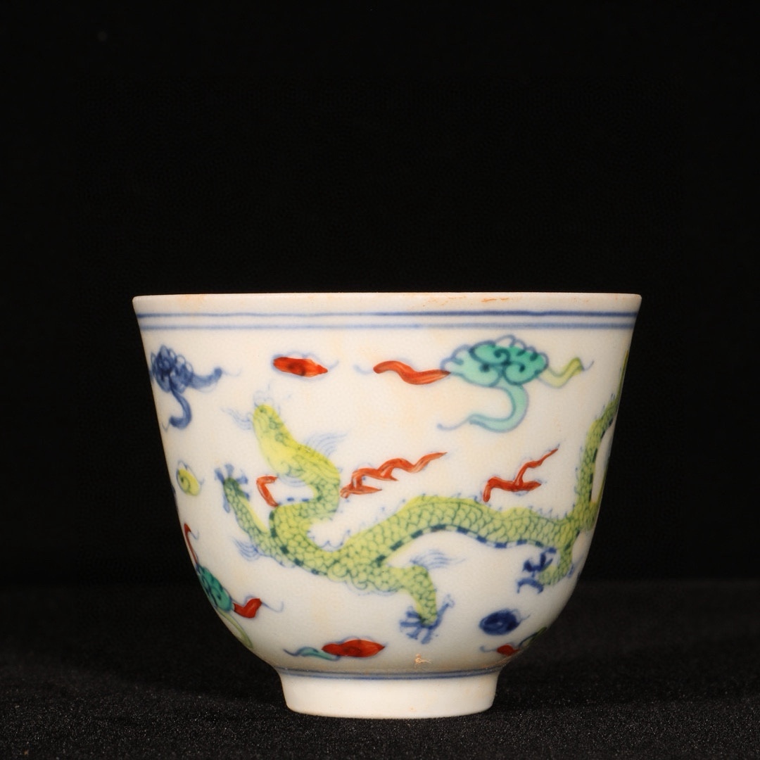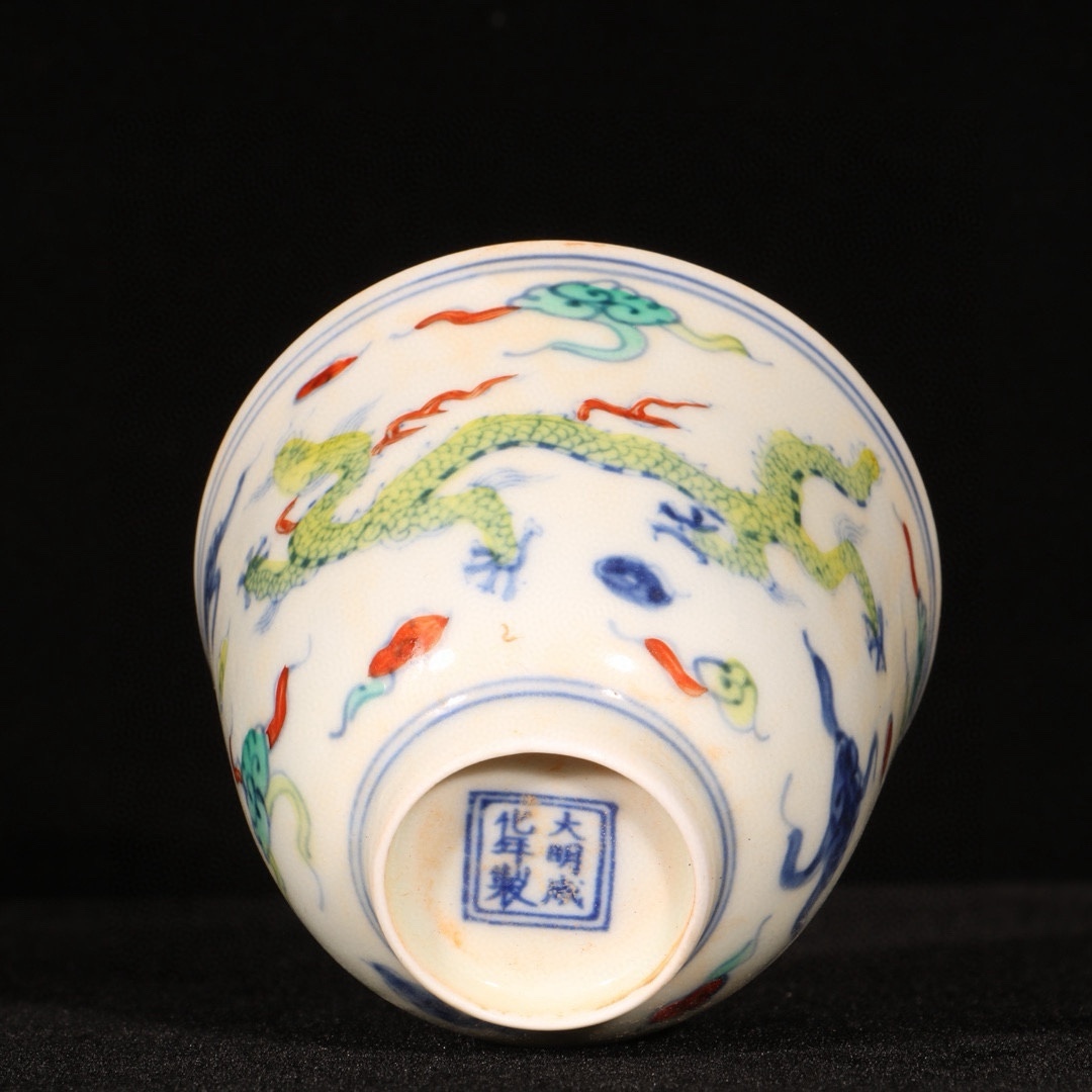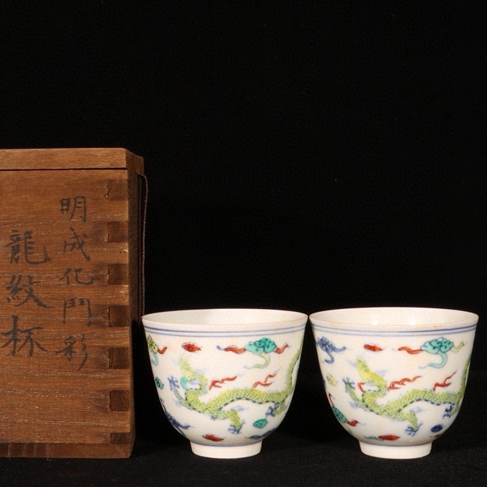 明時代 成化年製 闘彩龍紋杯 共箱付き 陶磁器 中国美術 高さ6 cm 直径7.3 cm 骨董品 唐物 808
