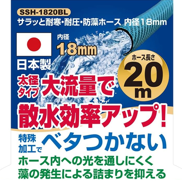 散水ホース 20m 内径18mm 日本製 サラッと耐寒耐圧耐藻ホース 丈夫 ホース ガーデニング 散水 清掃 セフティー3 SSH-1820BL
