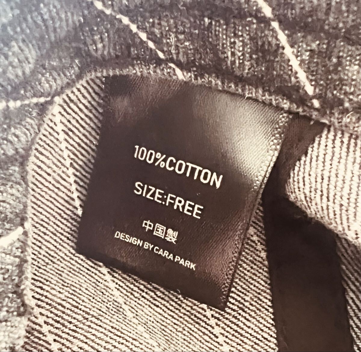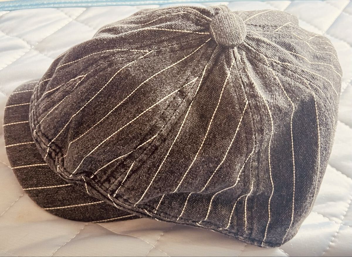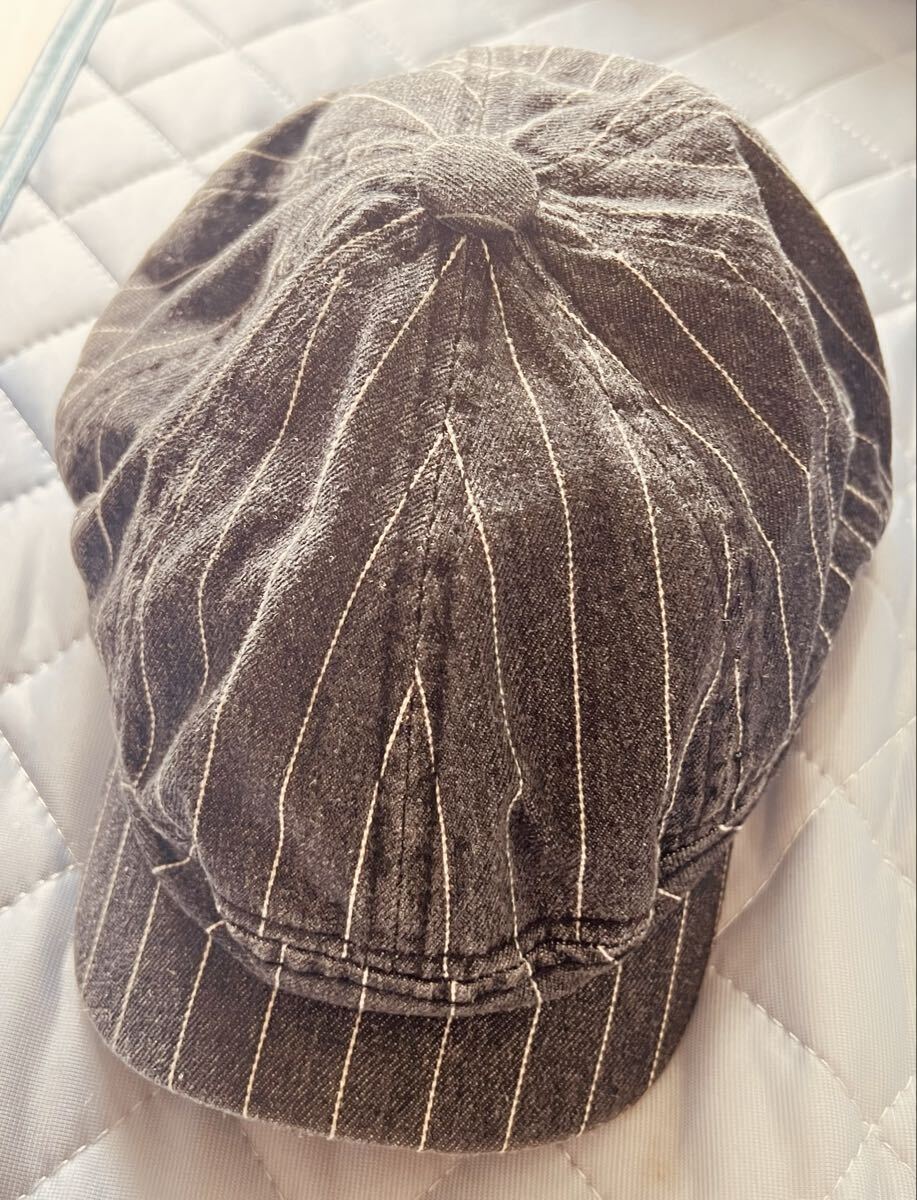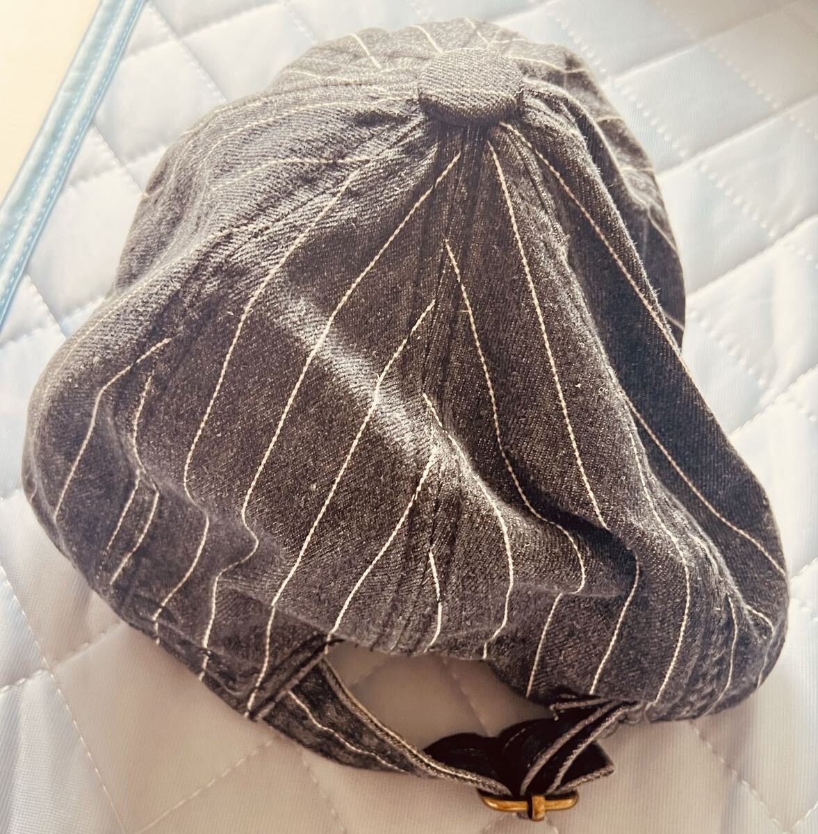 グレーと白のストライプデザインのキャップ、調整可能なバックストラップ付き。