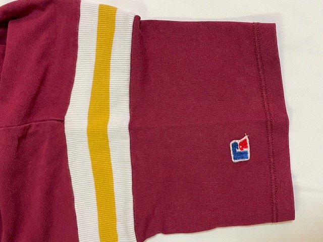 えんじベースで両袖に白&黄色のストライプ、袖にさりげなく入ったロゴなど細部にこだわったお洒落な逸品です。