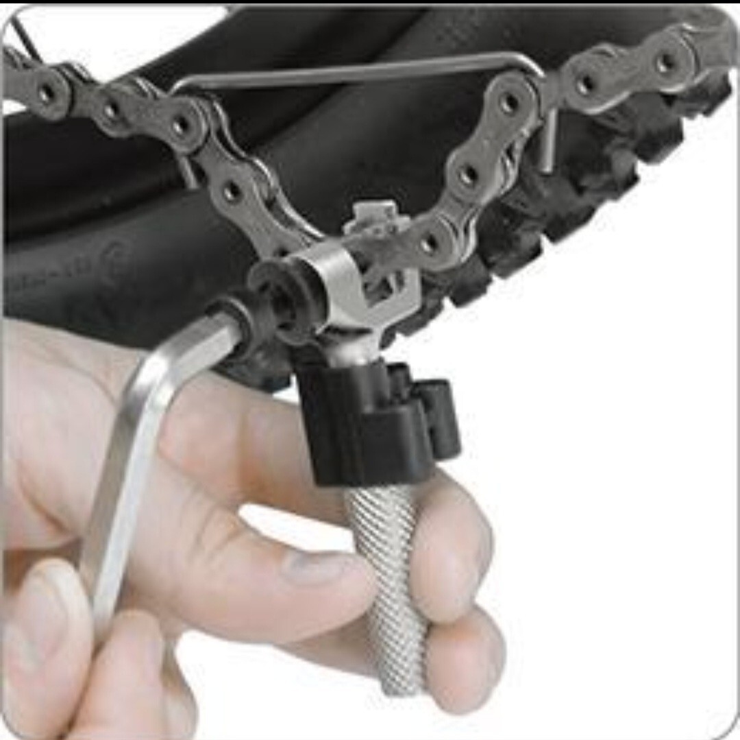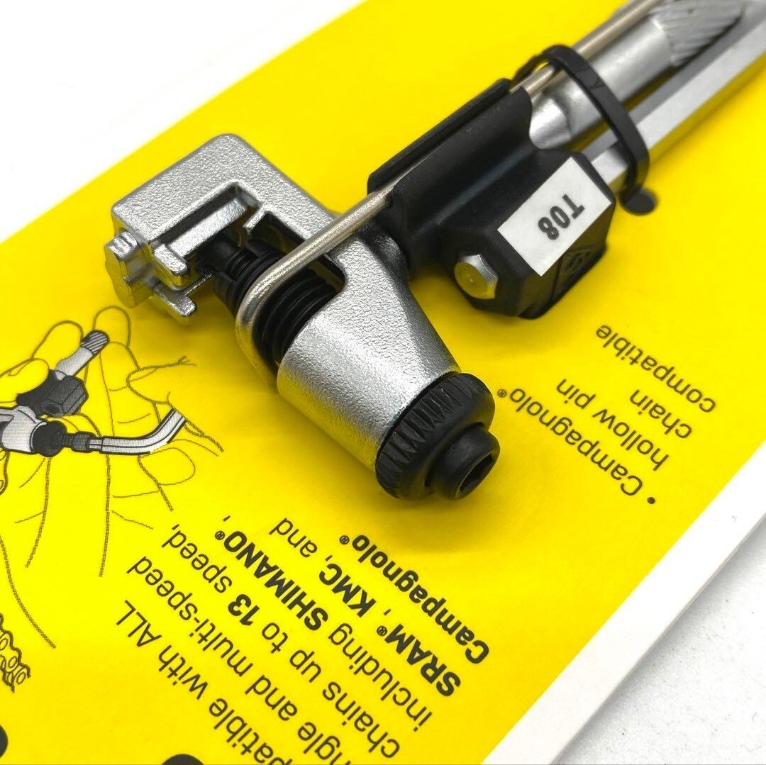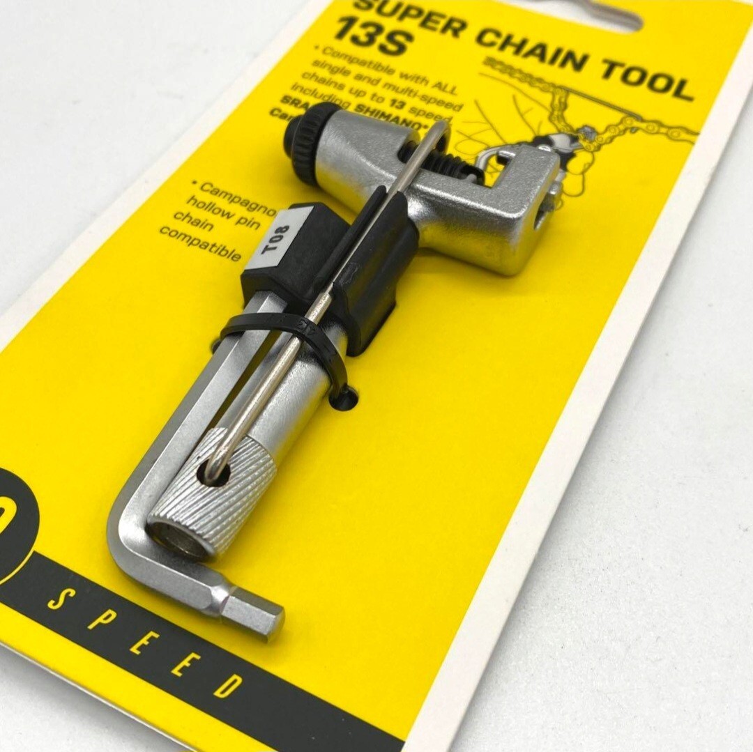 コンパクトなボディにチェーンフックまで付いたチェーンツール。 シングルスピード〜13 速、カンパニョーロ 13 速チェーン対応。