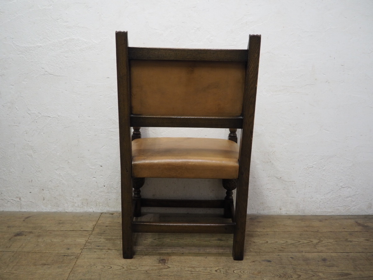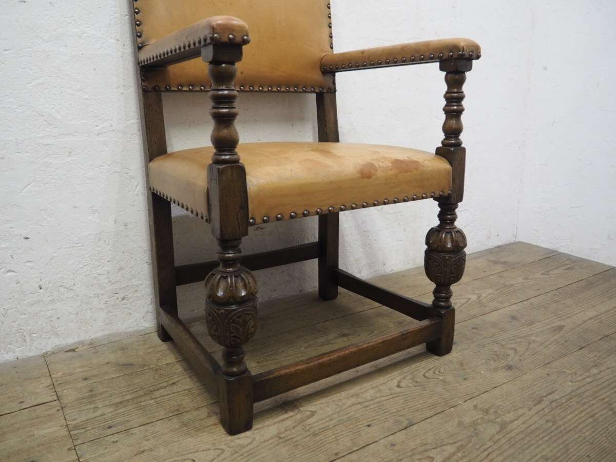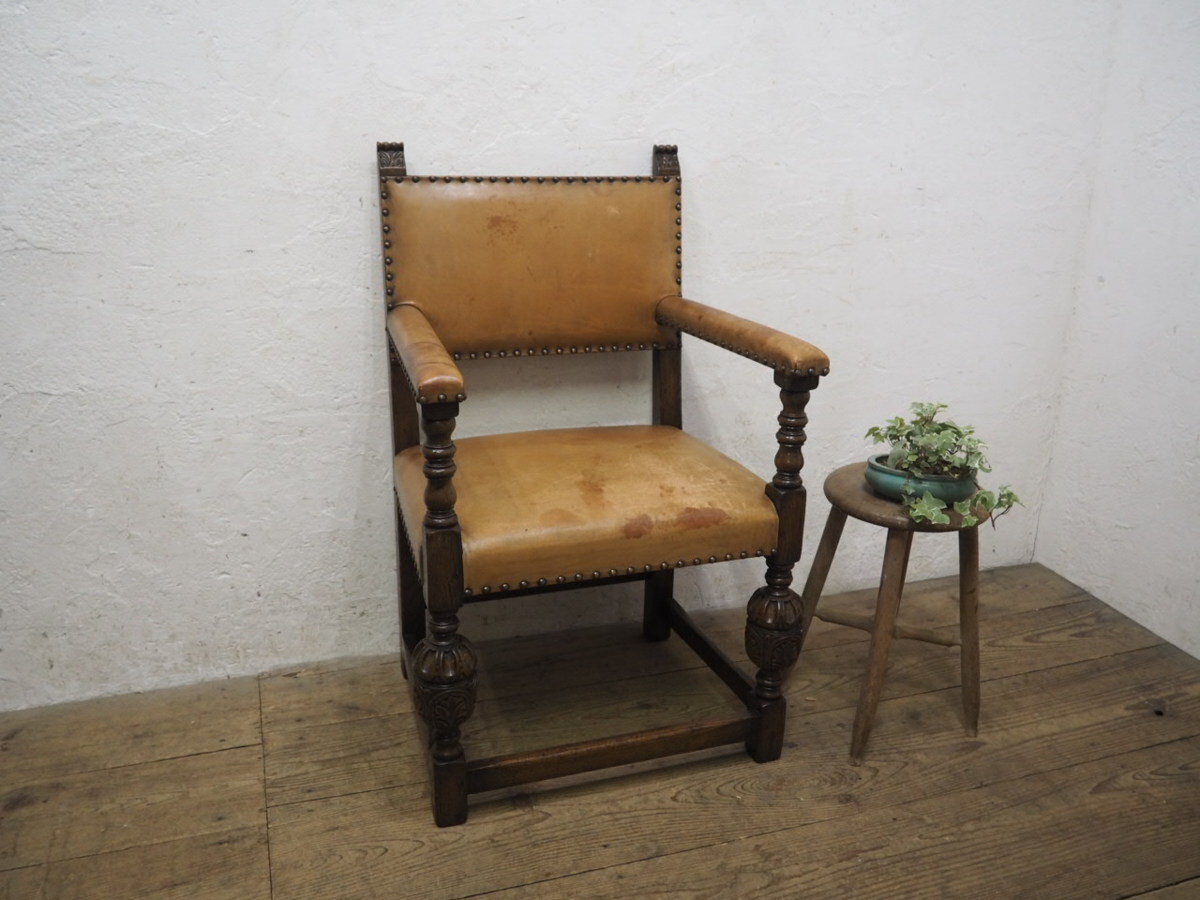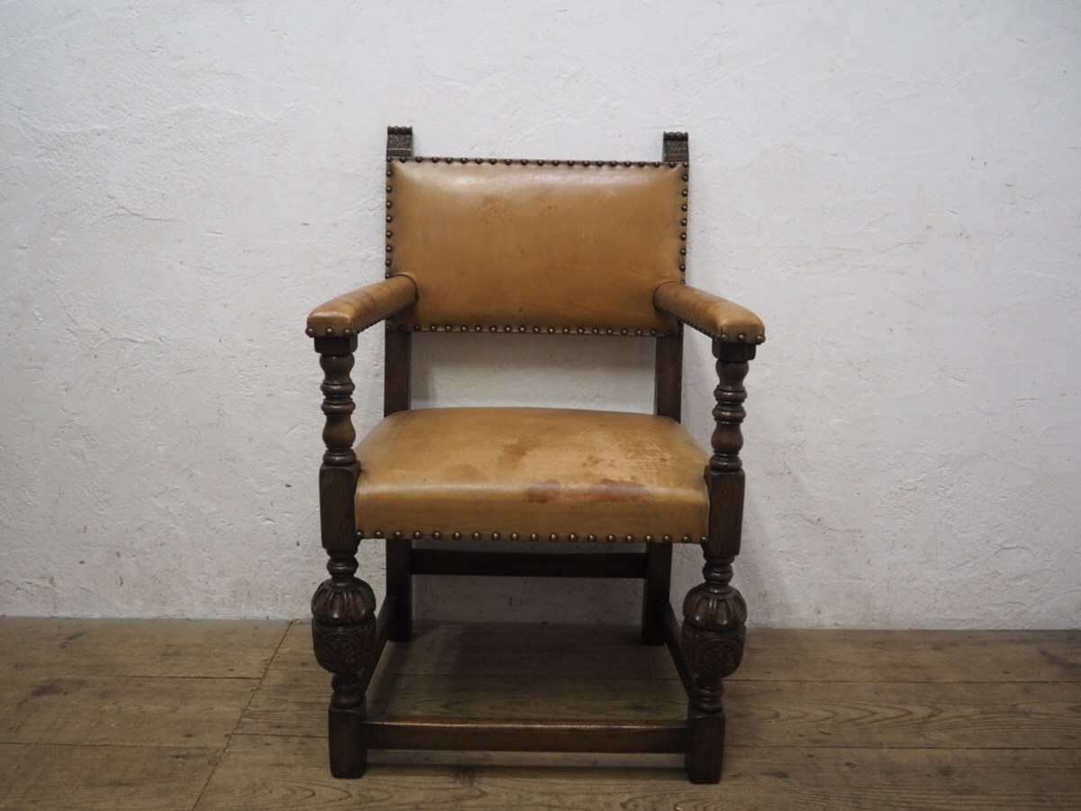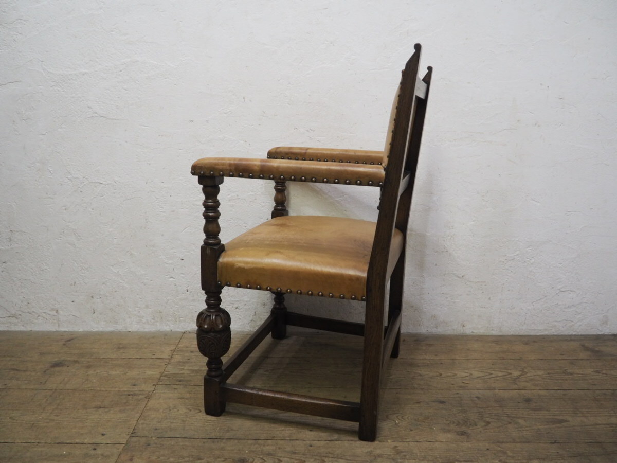 タA0285◆②イギリスアンティーク◆重厚な古い木製アームチェア◆英国家具 レザー 皮 革 椅子 イス カフェ レトロ オブジェ 純喫茶店N卸
