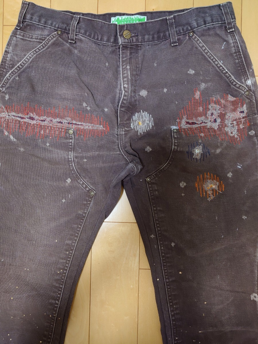 デザイン的なステッチワークのリペア、ペンキがアクセントになっています。