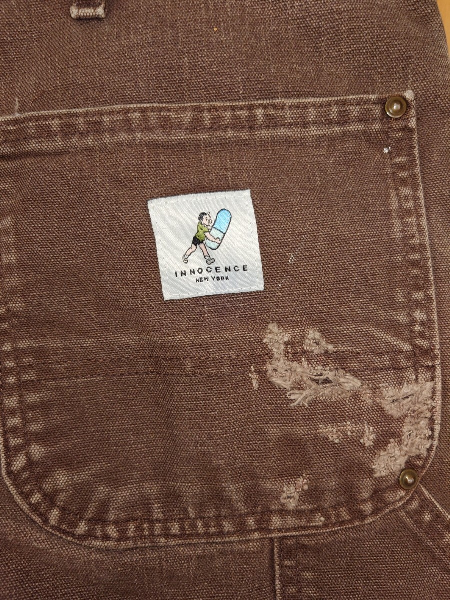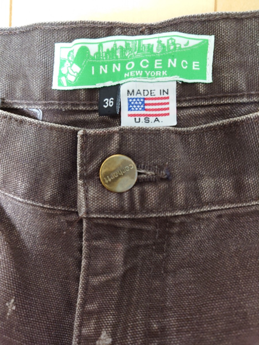カーハートのダブルニーを再構築しています。オリジナルのストレートのワークシルエットをテーパードスリムシルエットにして、丈を短くしてサイドにスリットを入れていますので、穿くとバランスが良くシルエットが綺麗です。