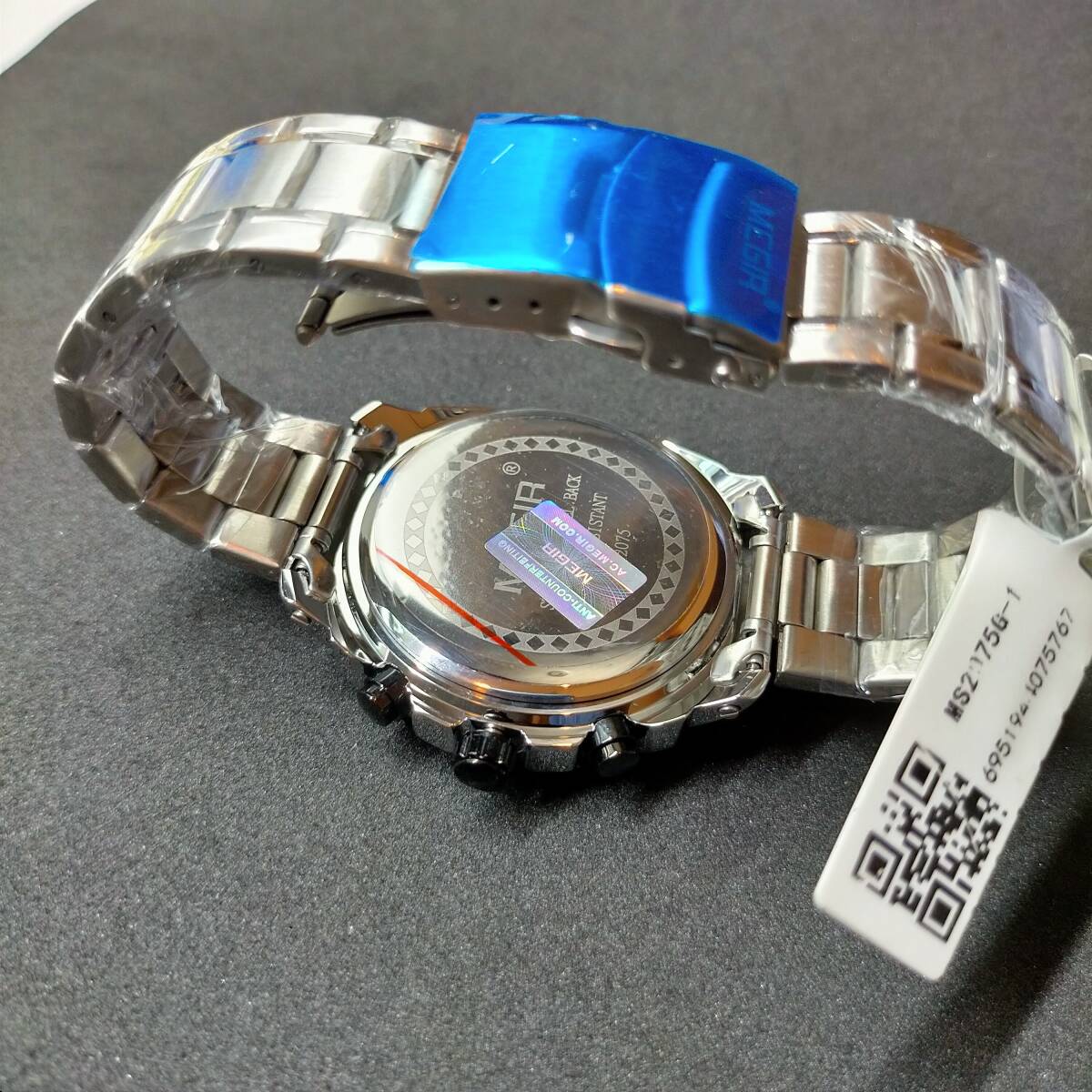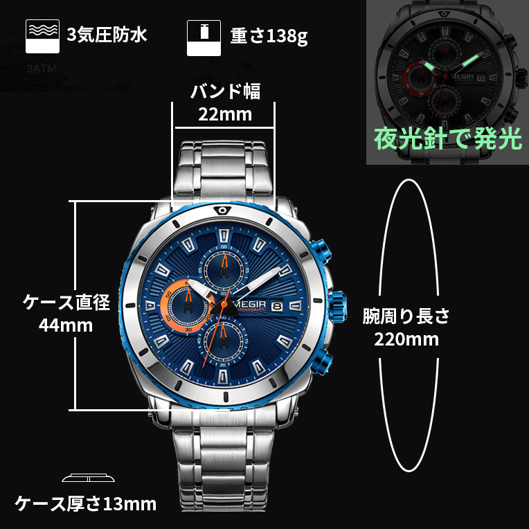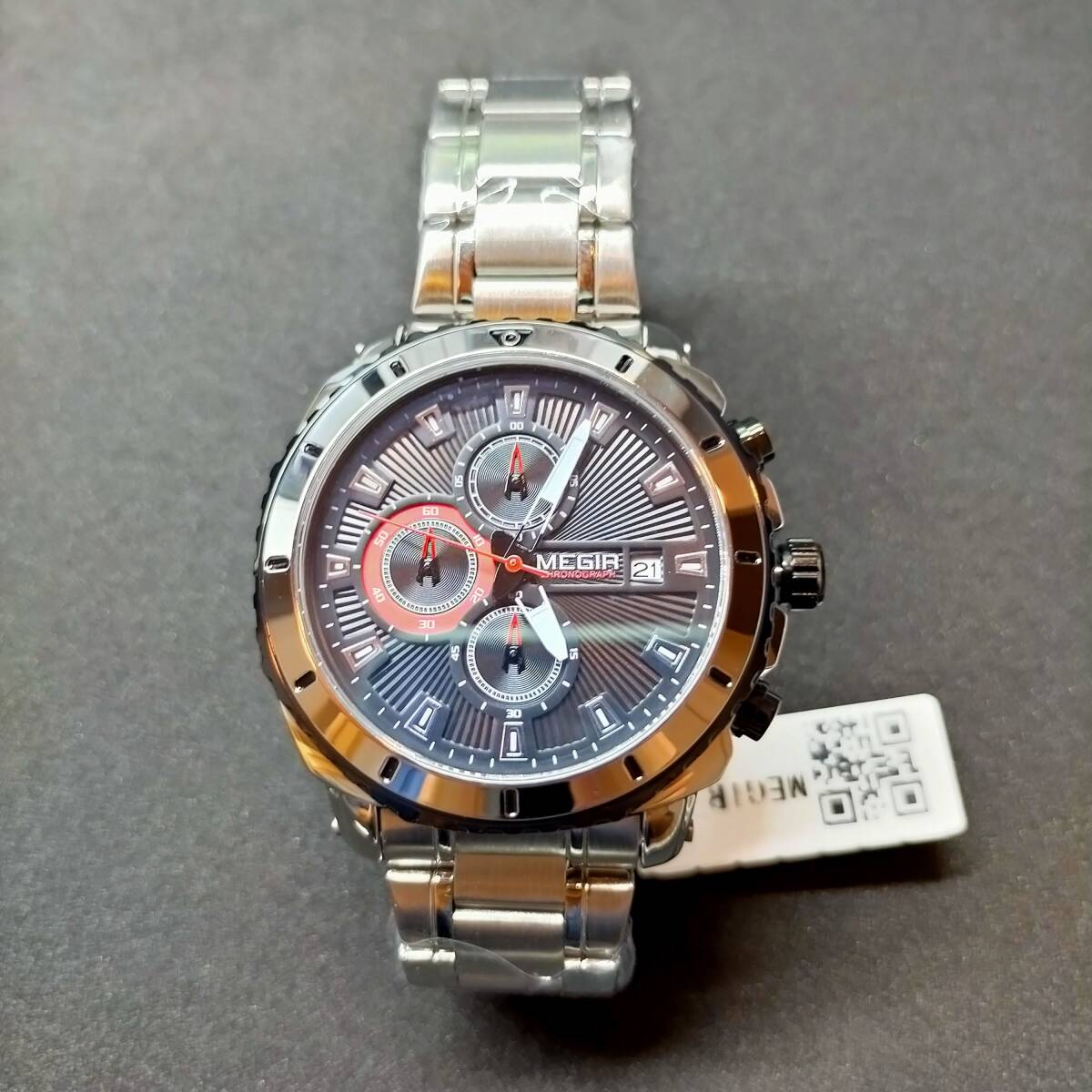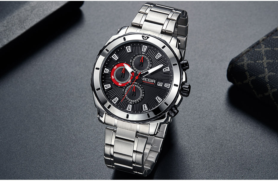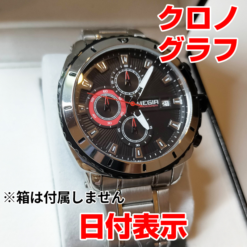 MEGIR社 新品クロノグラフ腕時計 3気圧防水 日付 ストップウォッチ ブラック黒 ステンレスシルバー スポーツ ビジネス