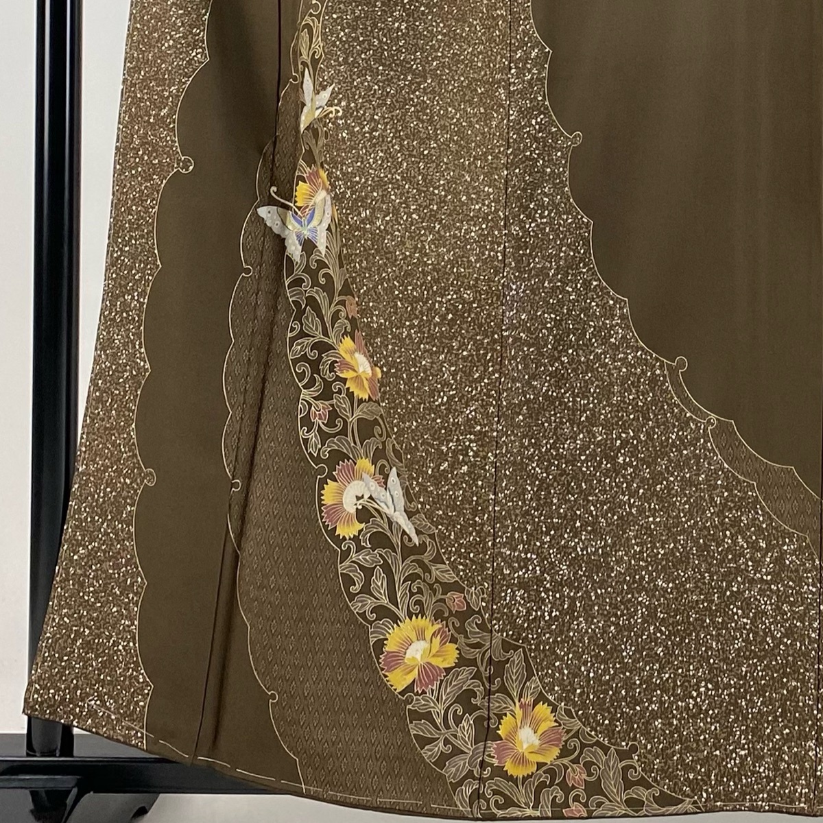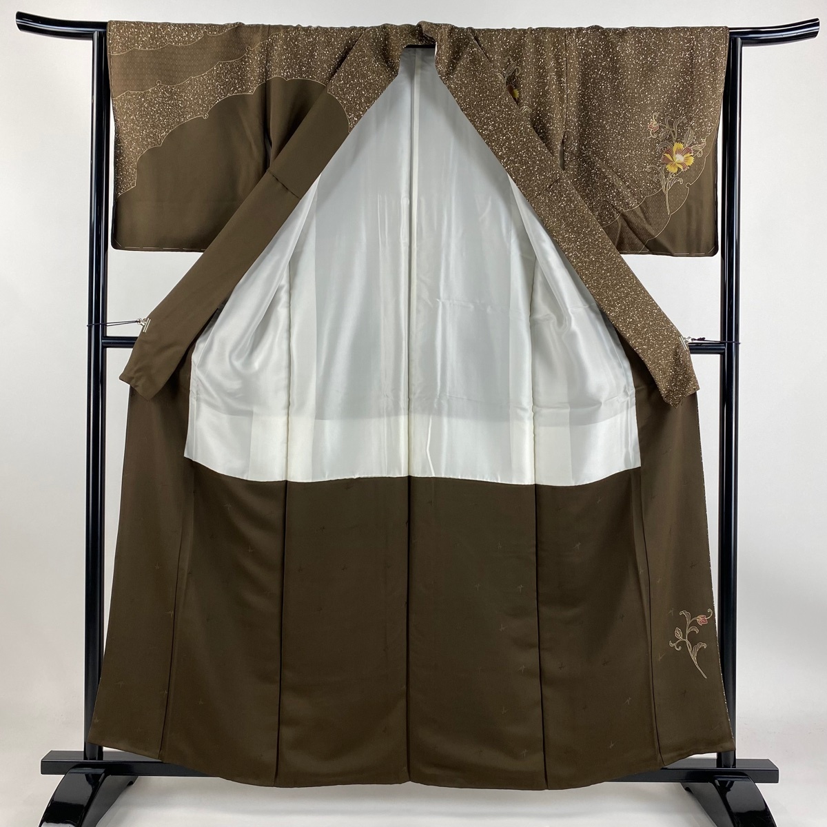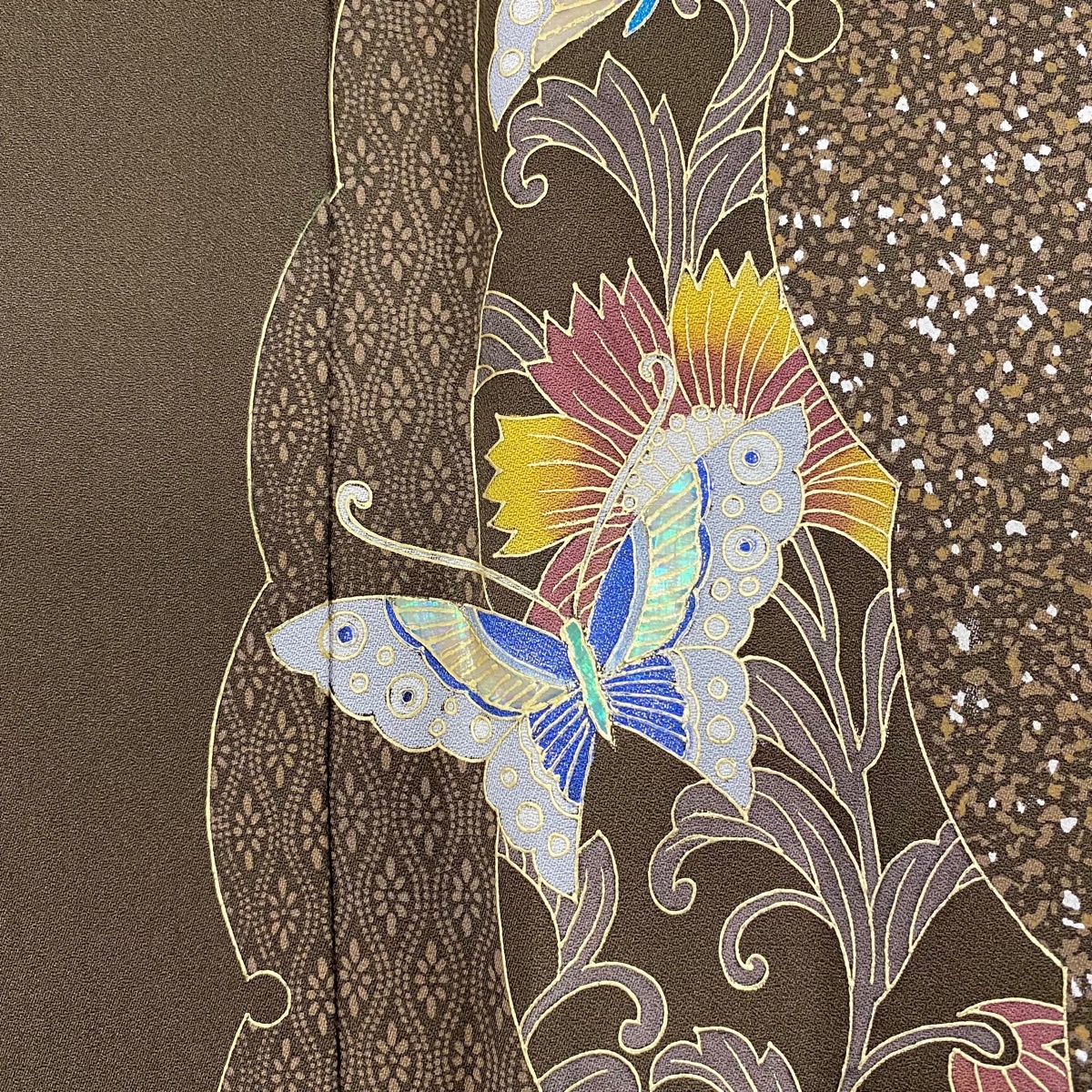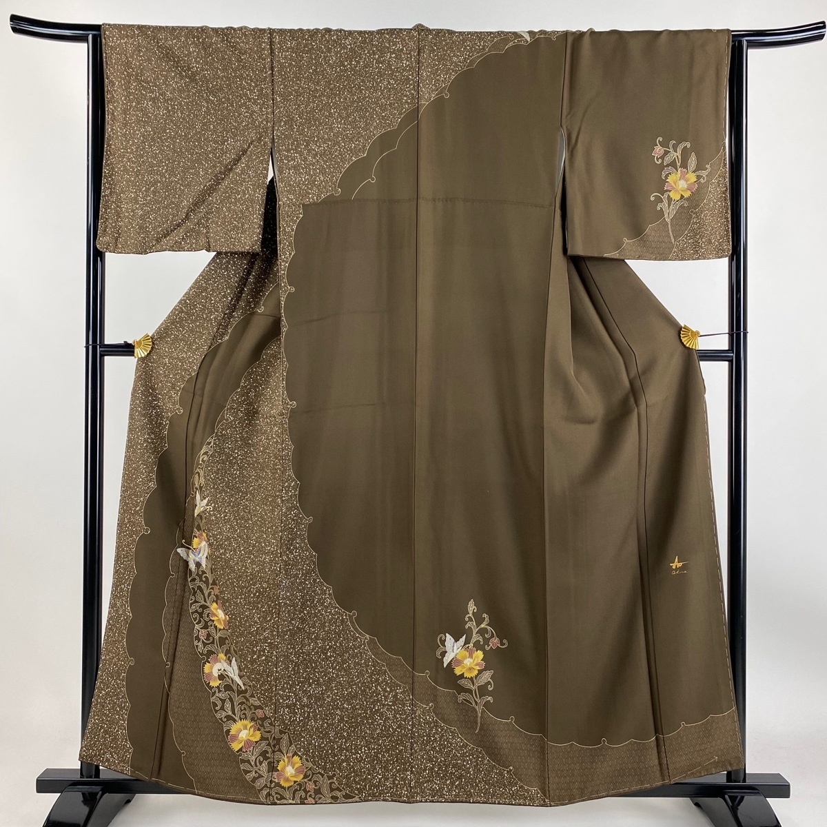| 訪問着 美品 秀品 落款 花唐草 蝶 金彩 螺鈿 焦茶色 袷 身丈159.5 裄丈64 M 正絹 【中古】 |