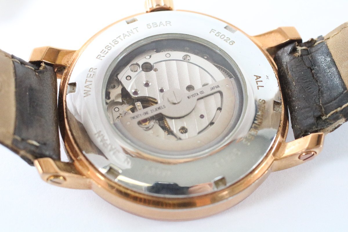 商品説明 | 【商品】 Furbo design フルボ デザイン F5026 裏スケルトン 自動巻き スモセコ メンズ 腕時計 ケースサイズ:約46mm(リューズ含む) 腕周り:約160mm 【商品説明】 ・中古品です。 ・現在稼働しておりますが、長時間の動作確認は 出来ておりません。 ・リューズでの時刻合わせは確認済みです。 ・ケース、ベゼル、中板、バックルに傷、擦れ、汚れ、くすみ等がございます。 ・風防、裏蓋に傷、擦れ、汚れ、くすみ等がございます。 ・ベルトは純正です。 ・ベルトのレザー部分の劣化が激しく傷、擦れ、ヨレ、ひび割れ、汚れ、シワ、剥げ、千切れ等がございます。 ・本商品は完全な動作を保証する物ではありません。 ・メンテナンスなどを行う事を前提としてお考え下さい。 ※メンズやレディース等の記載があるものは 弊社での主観となりますので、参考程度にお考えください。 ※現状上記は確認できておりますが、電池交換やオーバーホールをしておらず、商品出品時と商品到着時に一定の時間が経過する為、必ずしも同じ状態とは限りません。 商品到着時に上記動作確認が出来ない場合も返品はお受け致しかねます。商品状態に関しましては画像にてよくご確認ください。 ※弊社専門店ではない為、商品の詳しい仕様や詳細は分かりかねます。 ※USED品につき状態が気になる神経質な方、こだわり過ぎる方のご入札はご遠慮お願いします。 神経質な方の入札はお断り致します。 |