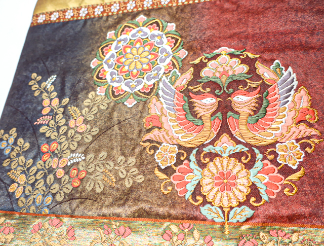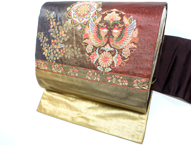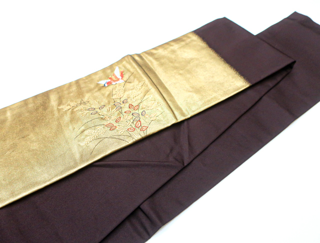 リサイクル商品ではございますが、良い状態のお品です。 地色は紫がかった焦げ茶です。(お太鼓は金×赤×青) 1枚目の画像が近いお色かと思われます。 素材は正絹です。 |