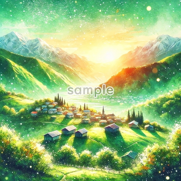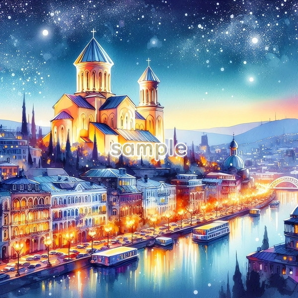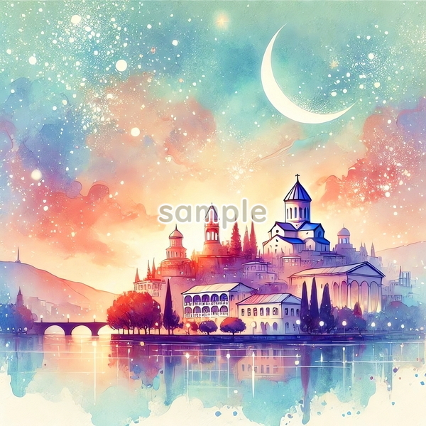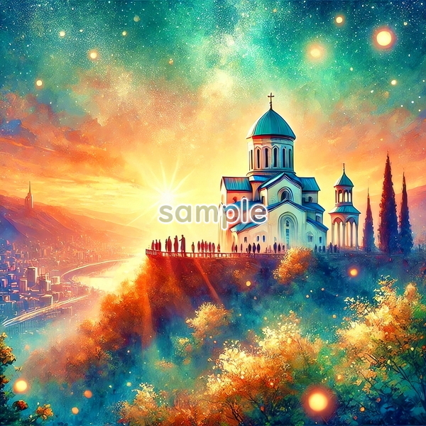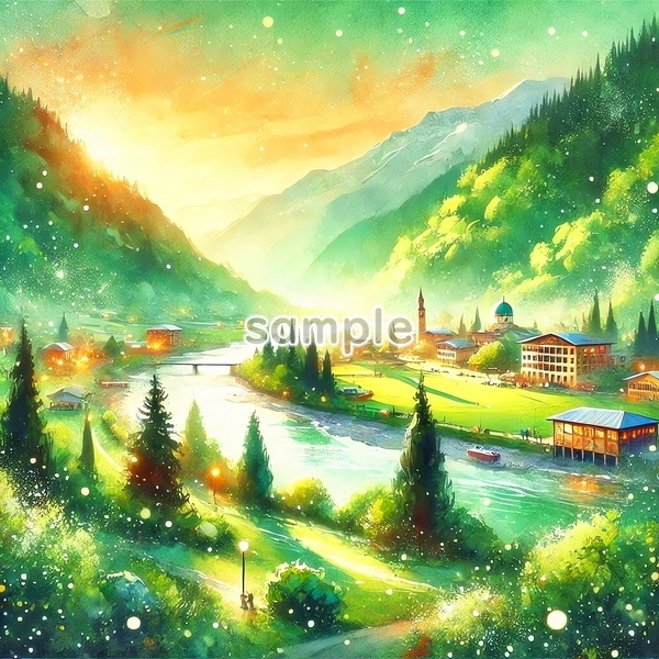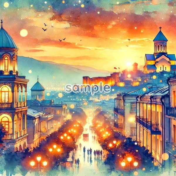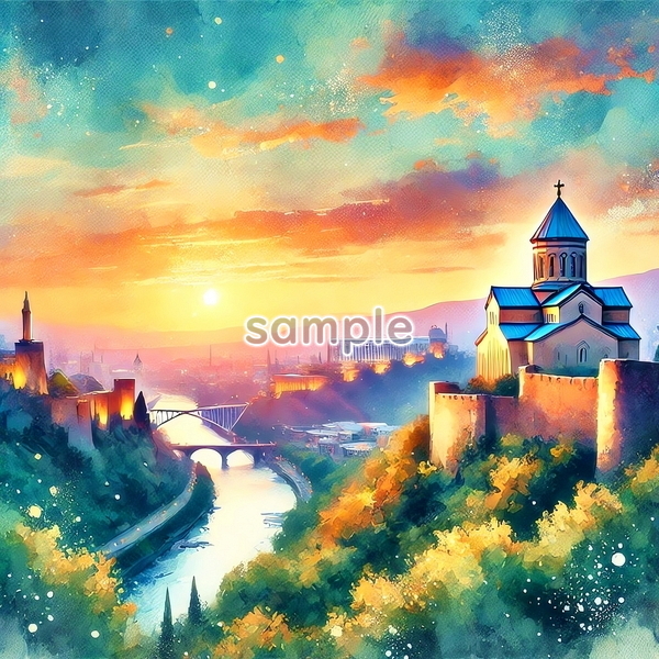 | ジョージア 世界国景色 緑と夕日と光 水彩 オリジナル絵イラスト 156P Georgia World country scenery green sunset light watercolor Original painting art picture image material |