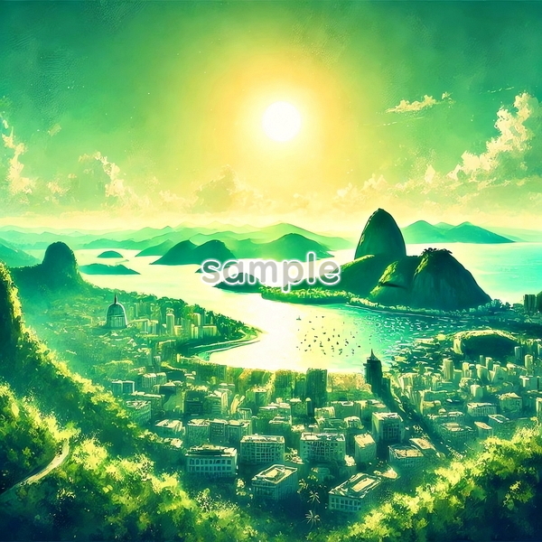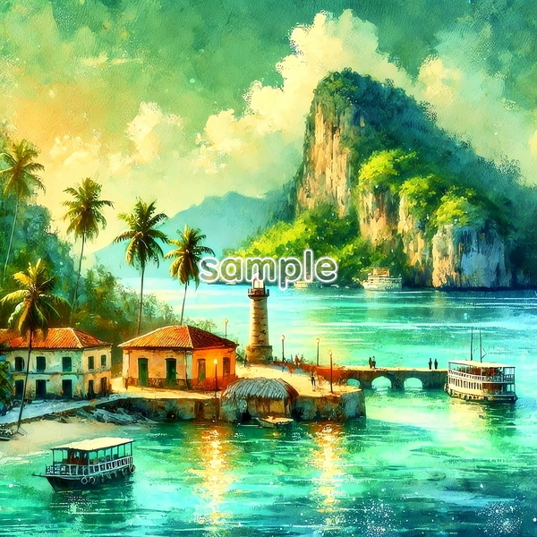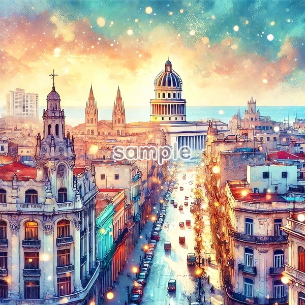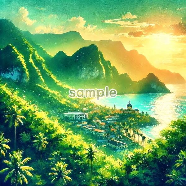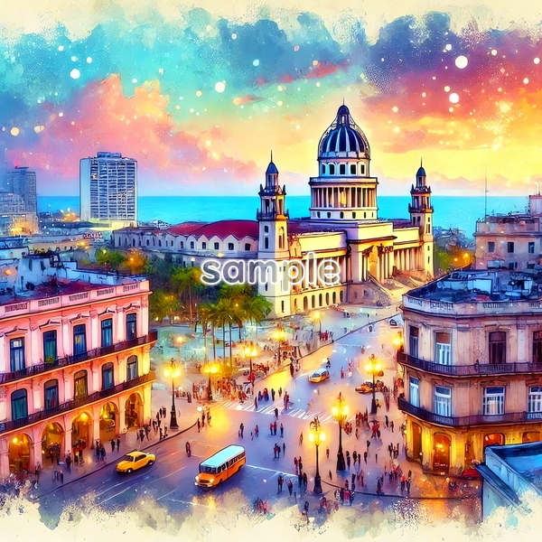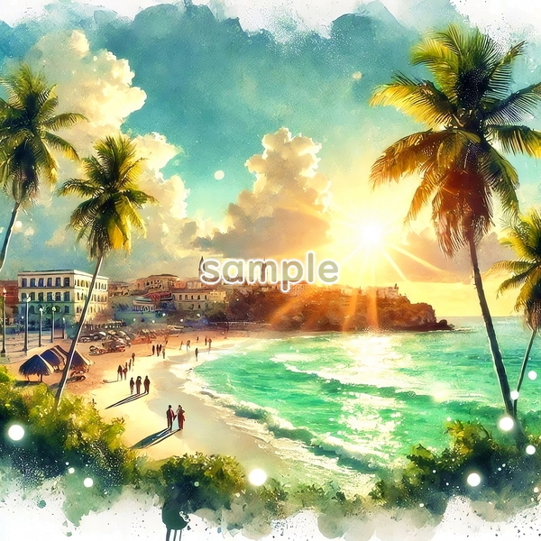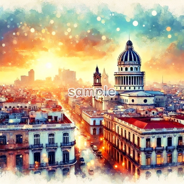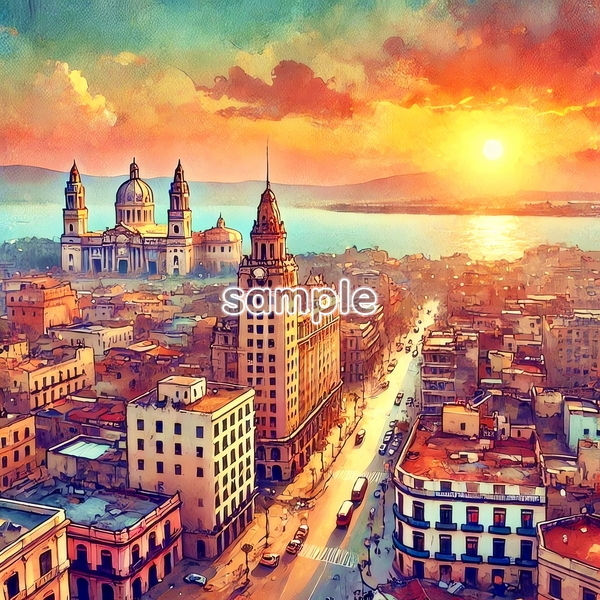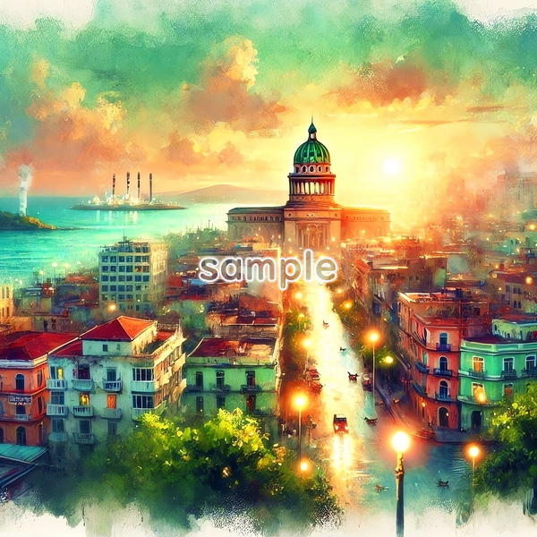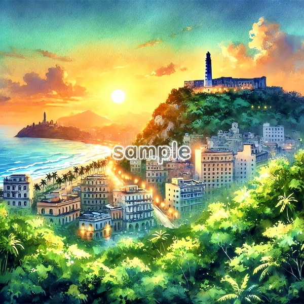 キューバ 世界国景色 緑と夕日と光 水彩 オリジナル絵イラスト 158P Cuba World country scenery green sunset light watercolor Original painting art picture image material