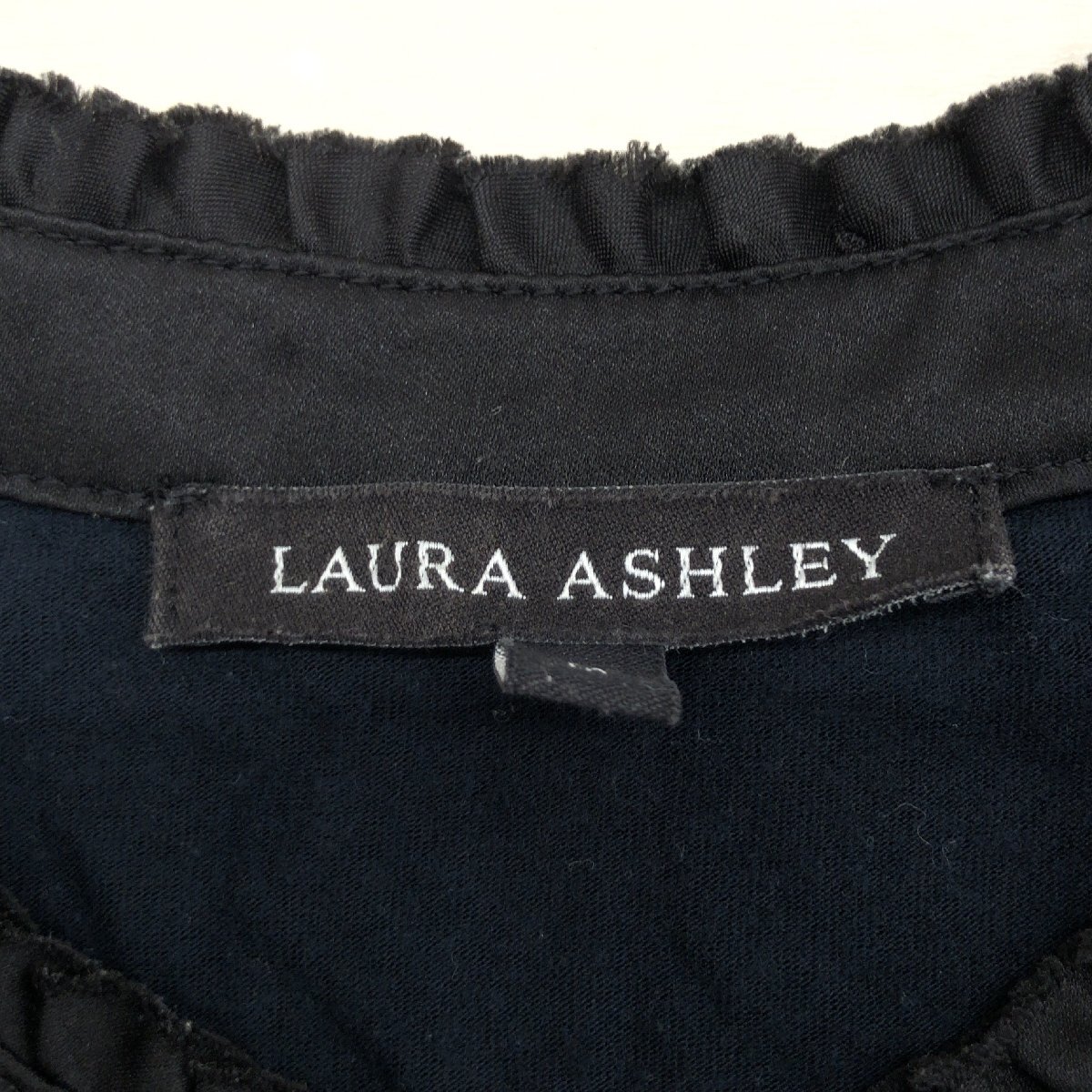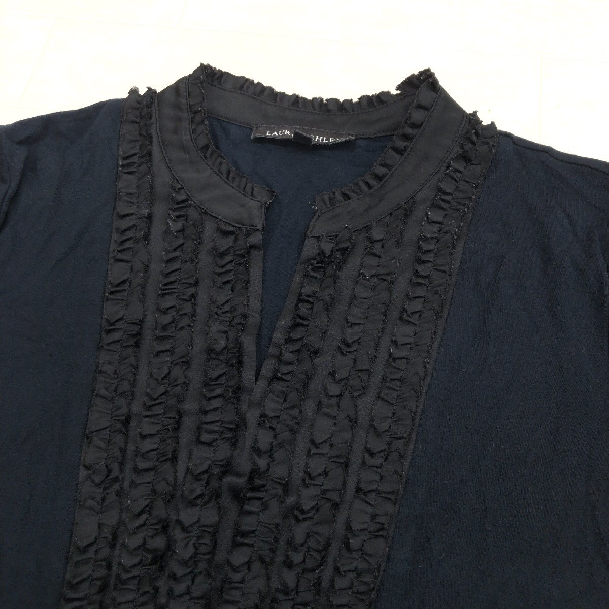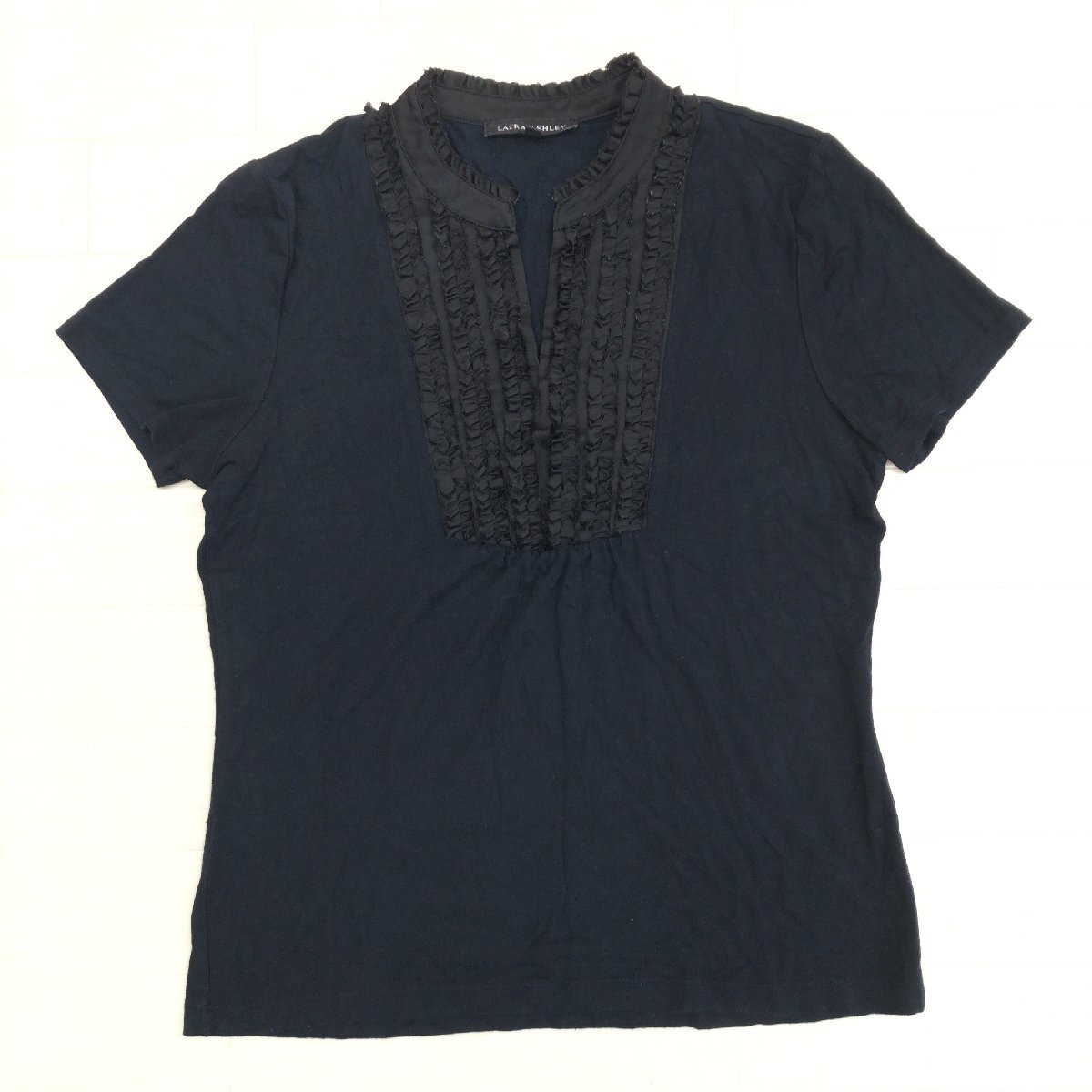 LAURA ASHLEY ローラアシュレイ サテン フリル ドッキング ストレッチ カットソー M 黒 ブラック Tシャツ 半袖 スタンドカラー レディース