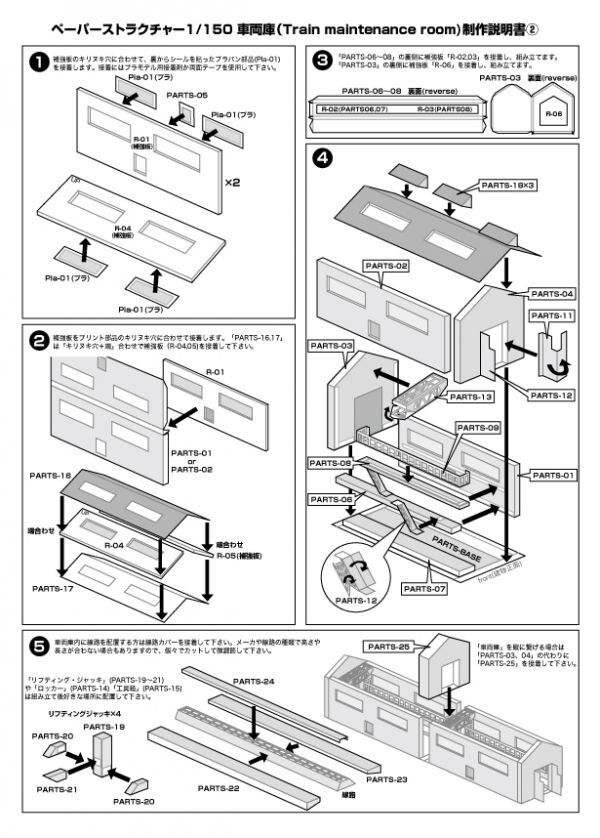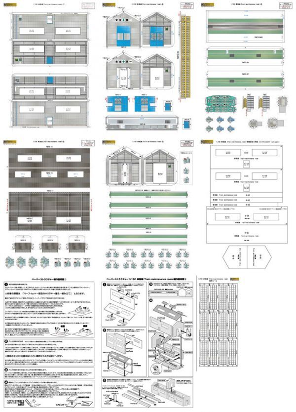 カラー印刷されたプリント部品を切りぬき、組み立てます。同封されているスチレンボードは建物・本体の内側から強度補強するために接着します。