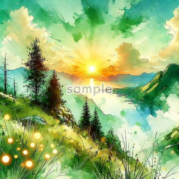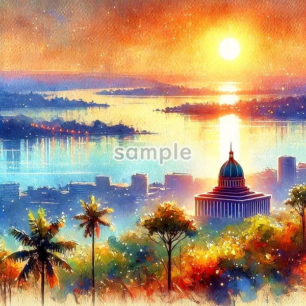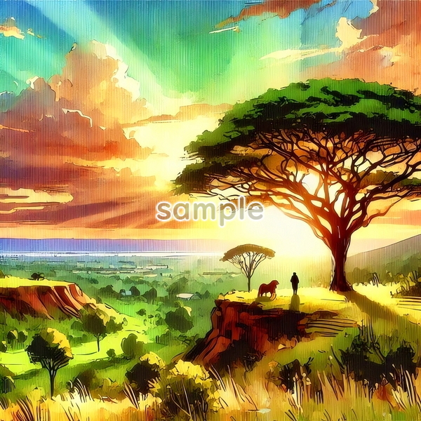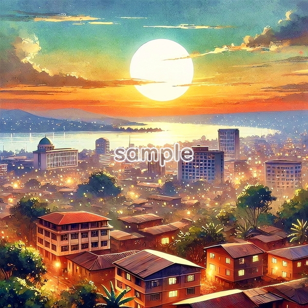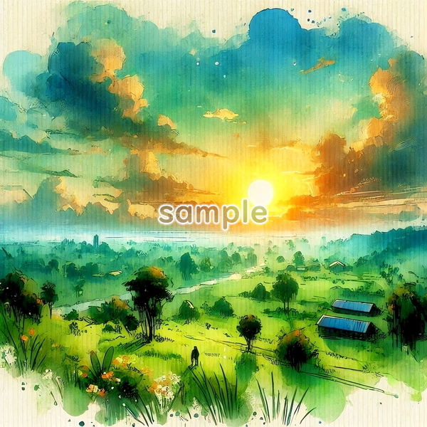 | 中央アフリカ 世界国景色 緑と夕日と光 水彩 オリジナル絵イラスト 156P Central Africa World country scenery green sunset light watercolor Original painting art picture image material |