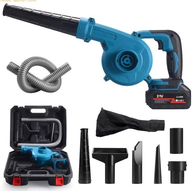 パッケージ内容:充電式ブロワー本体*1、ノズルA*1、ノズルB*1、ノズルC*1、延長チューブ*1、ダストバッグ*1、リチウムバッテリー*2、急速充電器*1