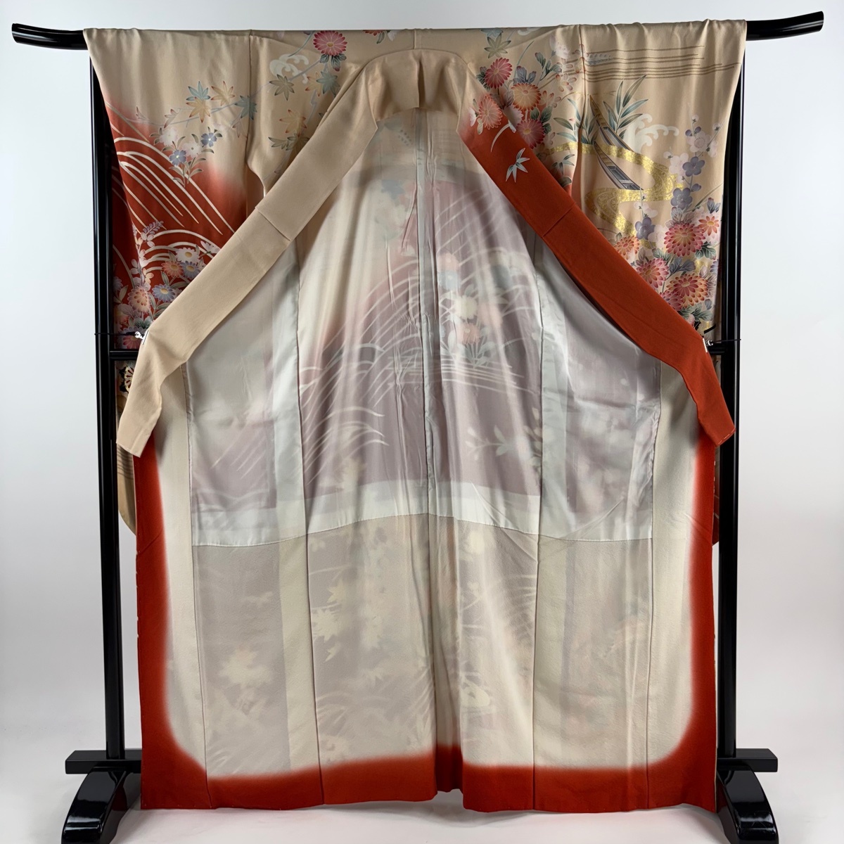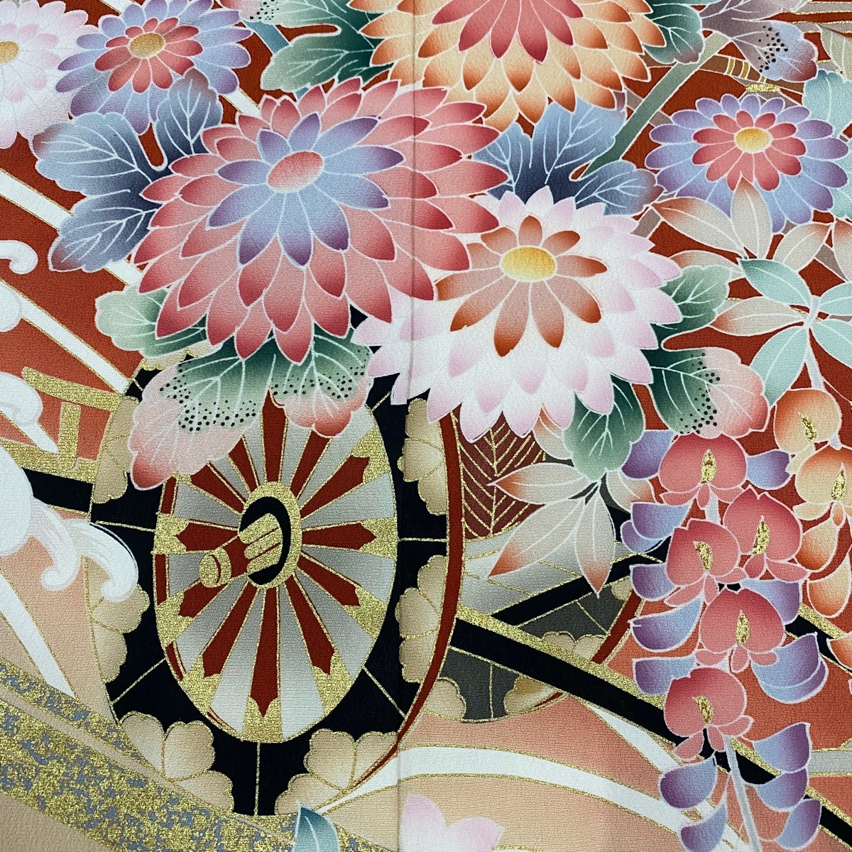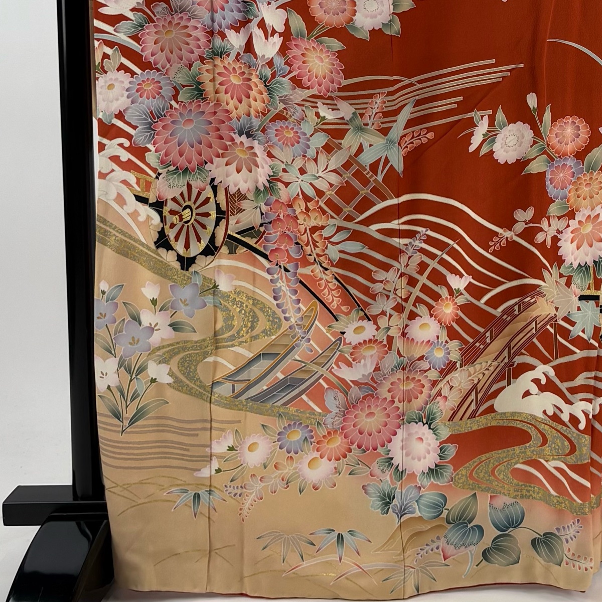 | 振袖 秀品 花ぐるま 流水 金彩 ぼかし 赤茶 袷 身丈169 裄丈68 L 正絹 【中古】 |
