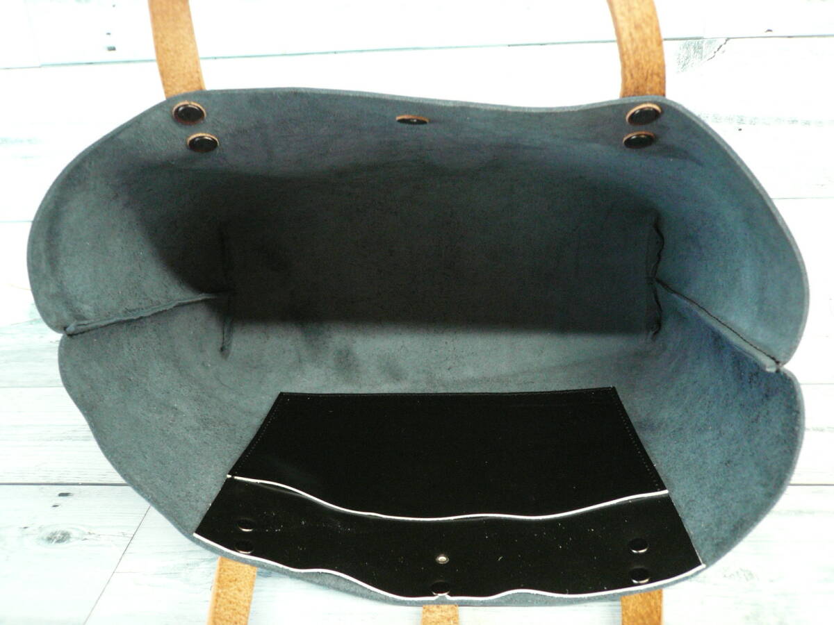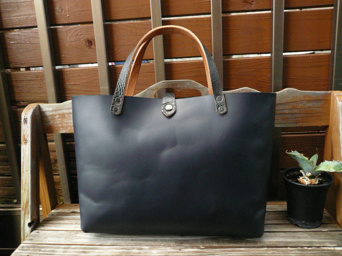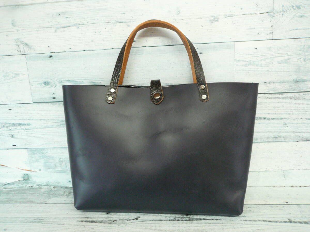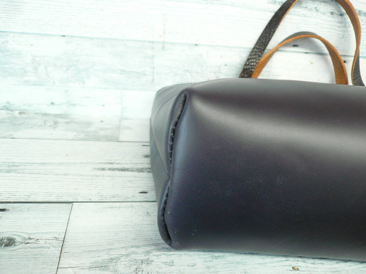 贅沢肉厚やや硬めハリありトートバッグ●牛革スムースレザーネイビーブルー系●ハンドメイドオリジナルバッグ●持ち手留め部分ヌメ革●225