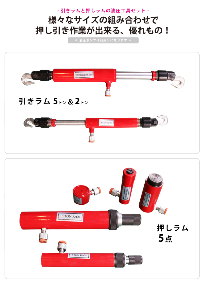 ●様々なサイズの組み合わせで押し引き作業が出来ます ●押しラム3個、引きラム2個はスプリング内蔵で自然復帰します ●写真に写っている物全てが1セットとなります *油圧ポンプは別売りになります |