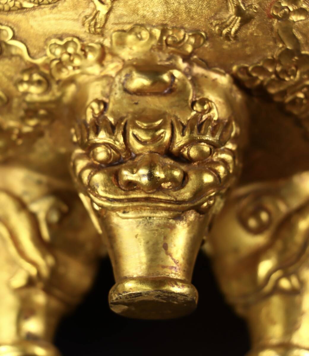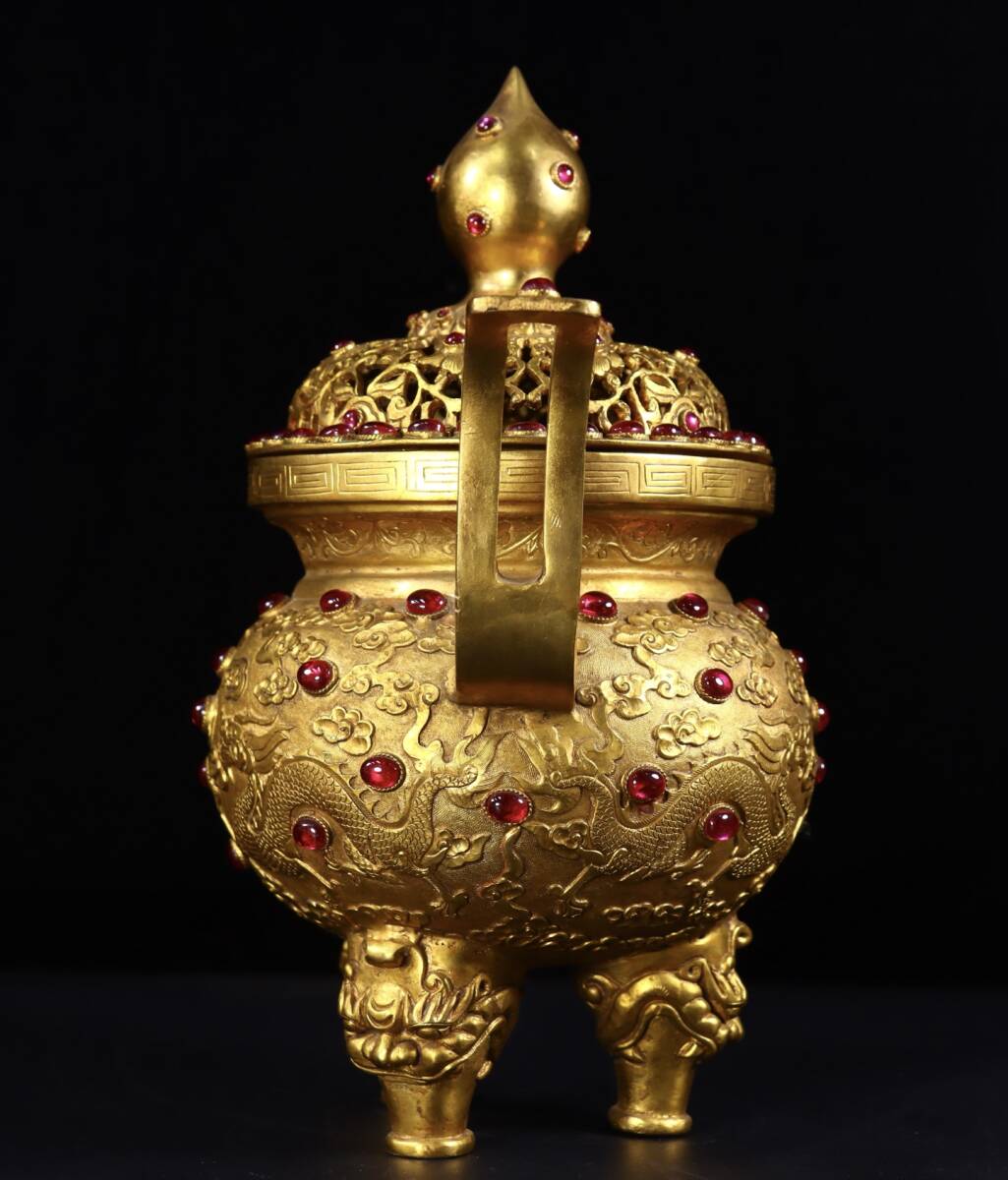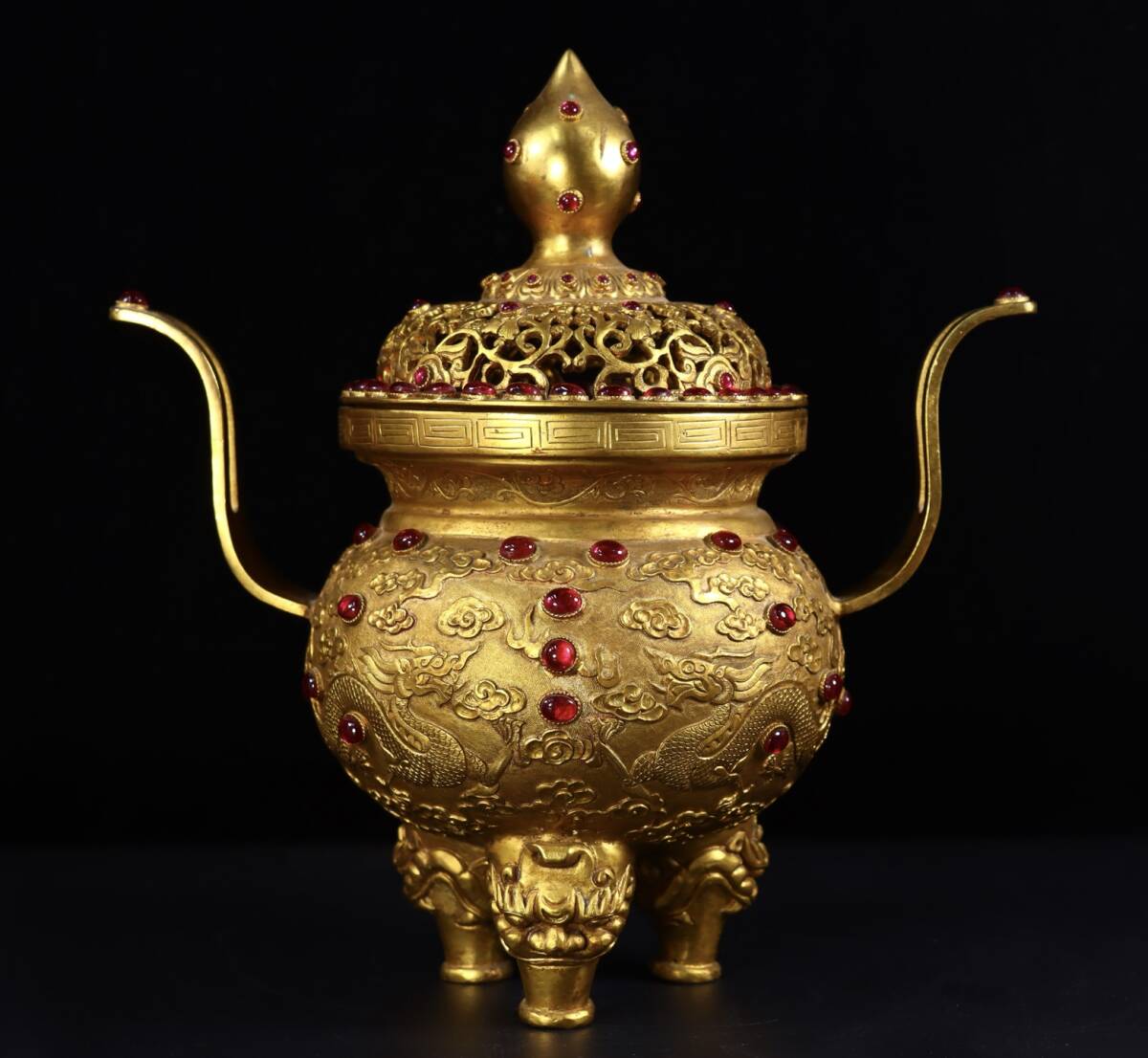唐物 清 純手工鏨刻 銅塗金 モザイク寶石 三足雙耳香爐 銅製 銅器 極細工 古美術品 時代物 中国古玩 骨董品 D68