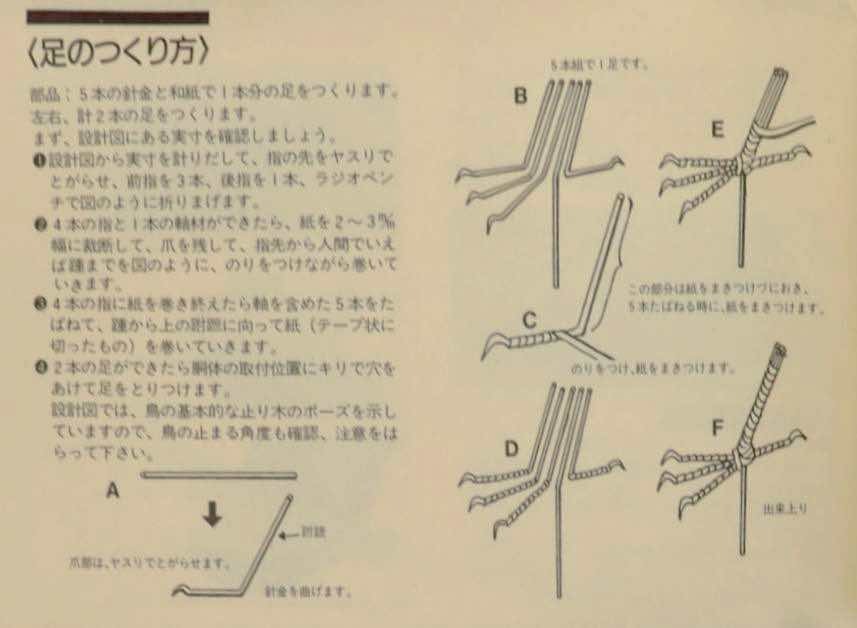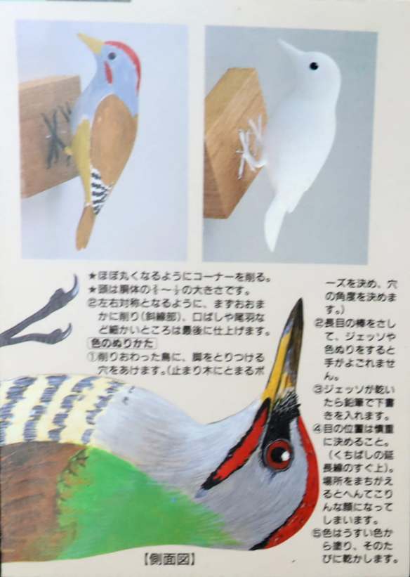 キット内容は 本体、目玉、脚用ハリガネ、サンドペーパー、止まり木、解説書 で、絵の具、ニスなどの塗料は付属しません。
