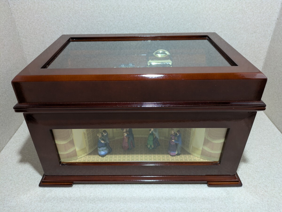 スイッチを入れるとシリンダーが回転して曲が流れ、下のボックスの中ではLEDが点灯して人形が動き出します。スイッチを切ると曲が終わった時点で止まります。