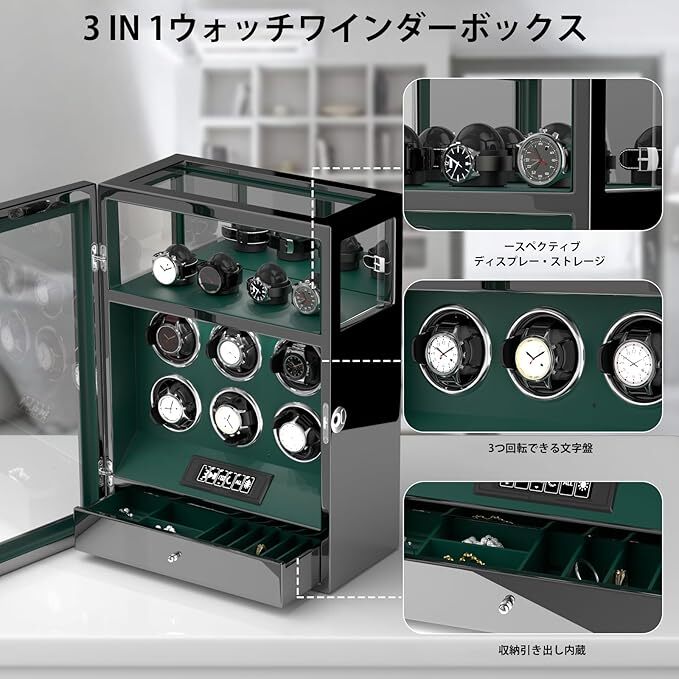 大容量:ワインディングマシーンには6つの巻き上げダイヤルと4つのウォッチホルダーが備わっており、複数の時計をディスプレイすることができます。また、ほこりや摩耗から時計をしっかりと保護し、下部には取り外し可能な引き出しが付いており、サングラス、ネックレス、リングやイヤリングなどを収納できます。
