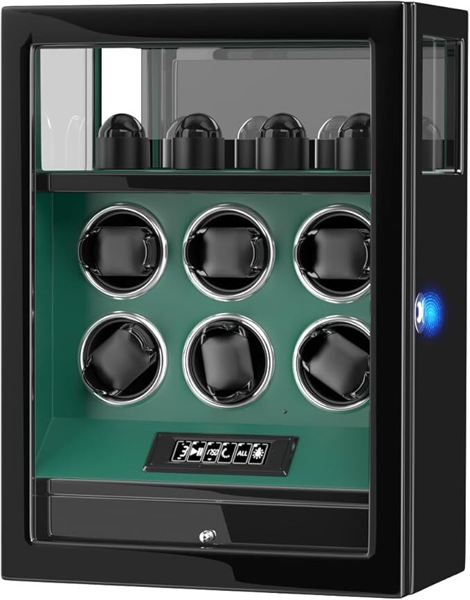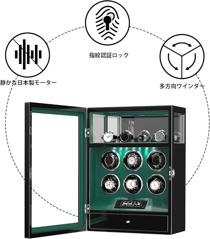 DUKWIN ワインディングマシーン 6本巻き上げ+4本収納 自動巻き時計ワインディングマシーン 日本製モーター ウォッチワインダー 腕時計自動巻き上げ機 369本巻き 木製 指紋ロック 4ウォッチホルダー 静音 LEDライト付き ジュエリー収納引き出し 男女向け (グリーン)