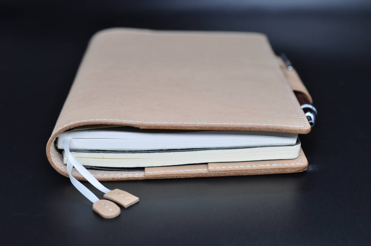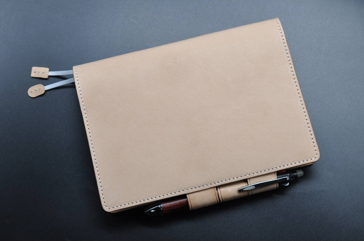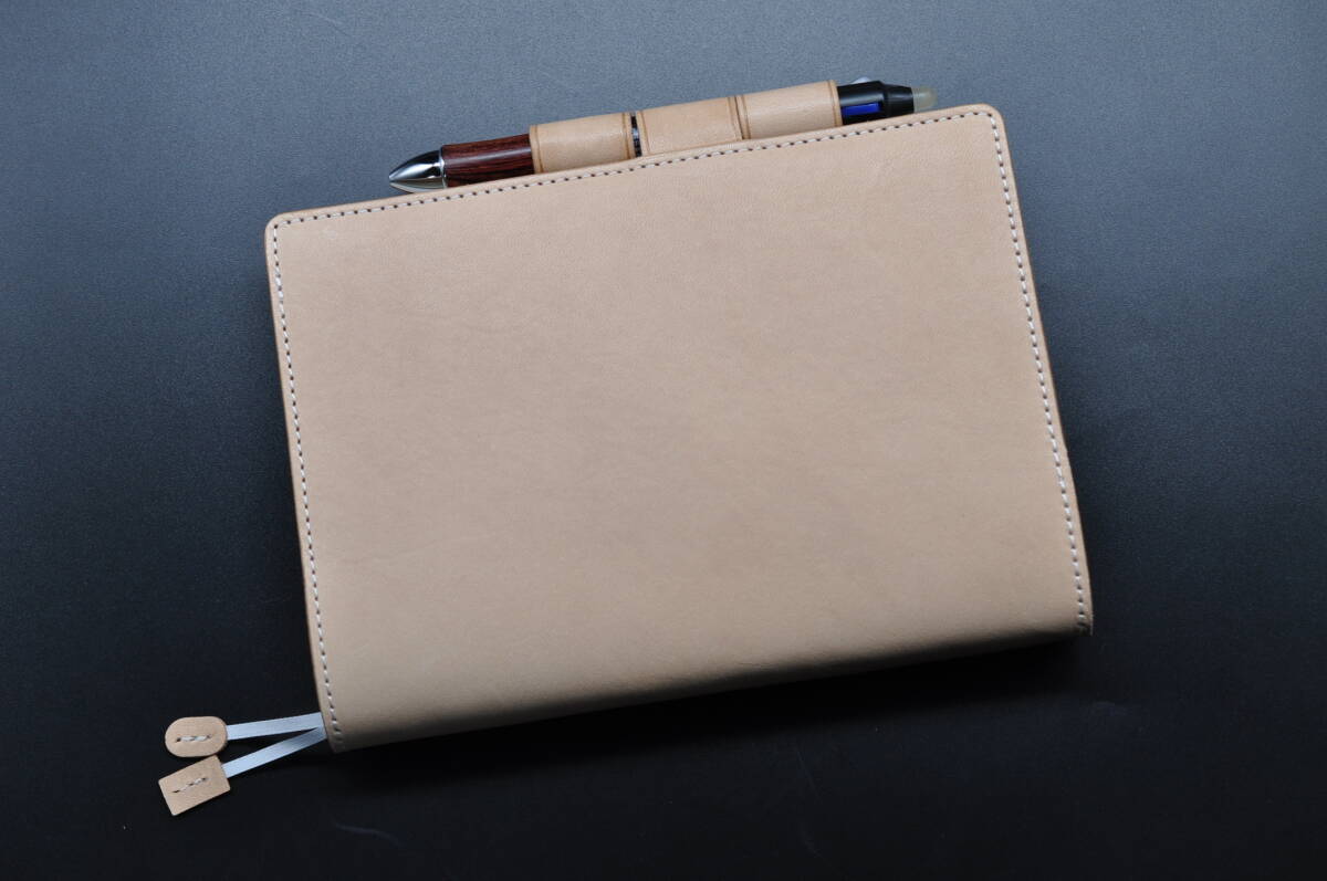 素材は100%植物タンニンのピット槽でじっくり時間を掛けて鞣した、革好きには堪らない栃木レザー社の本ヌメ(厚み1.5mm)で作った手帳カバー(B6サイズ)です。