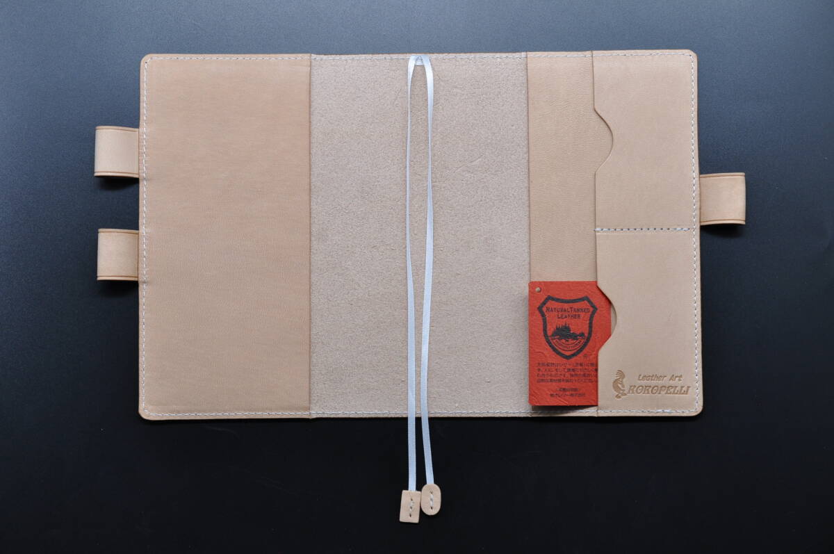 内側に、名刺入れ(カード入れ)2か所、ブックマークは2本付けています。