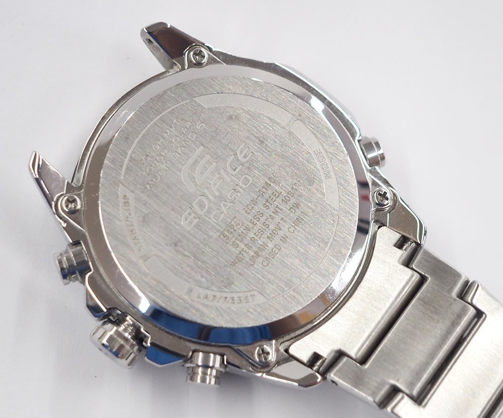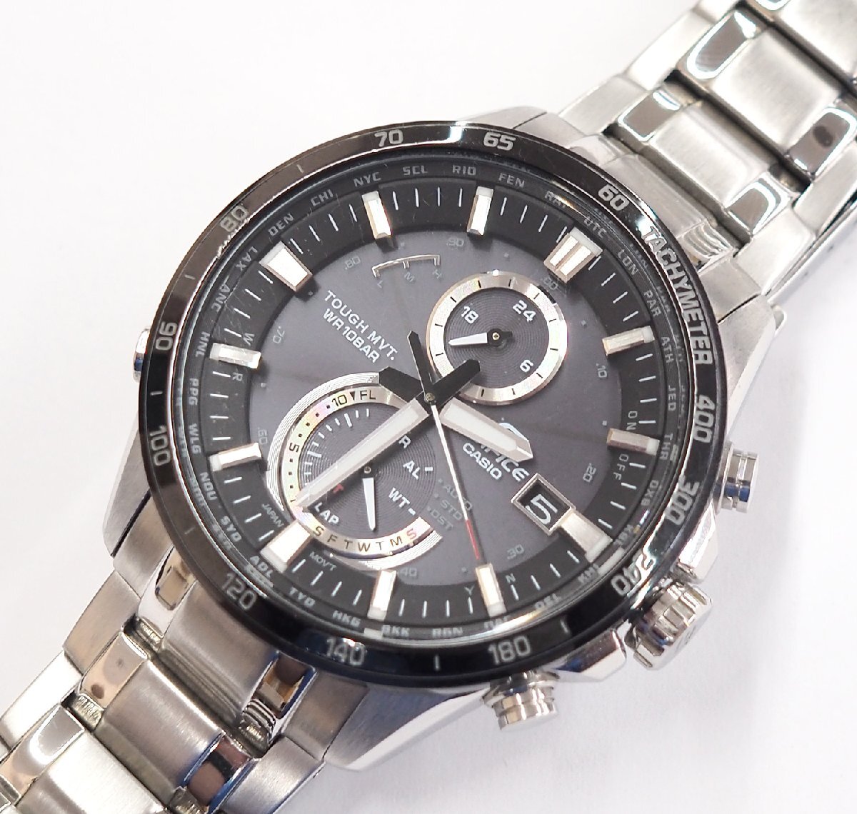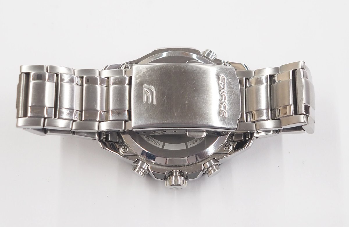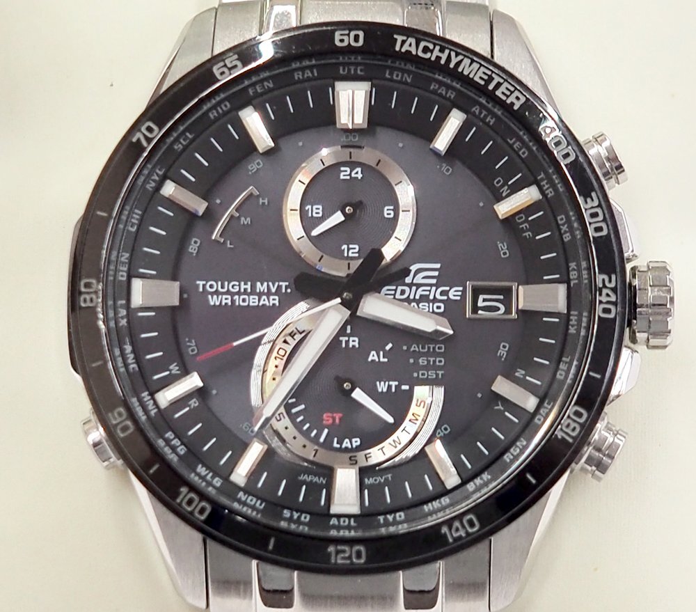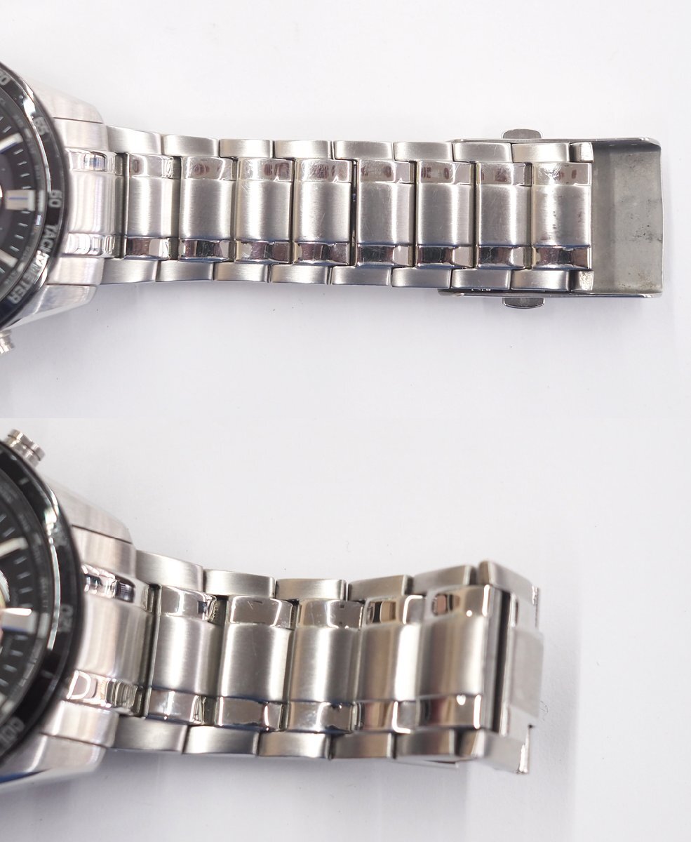 バンド:ステンレス 長さ150~205mm 現在 約178mm ケースサイズ:48.3×45.1×12.1mm 質量:156g タフソーラー(ソーラー充電システム)・10気圧防水機能 アラーム機能・クロノグラフ パワーリザーブ表示機能 ワールドタイム・曜日表示 |