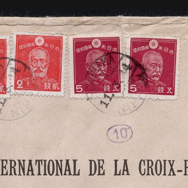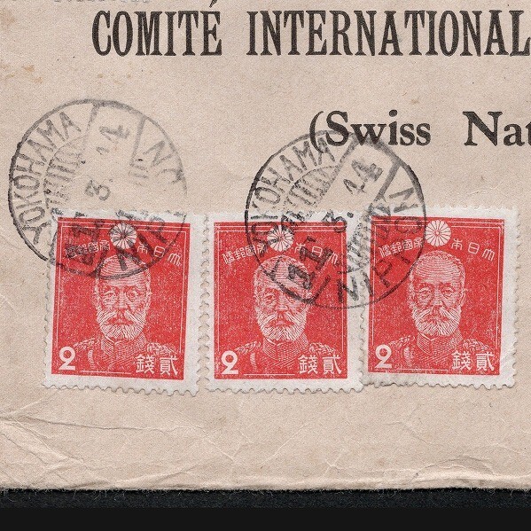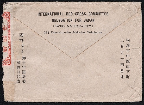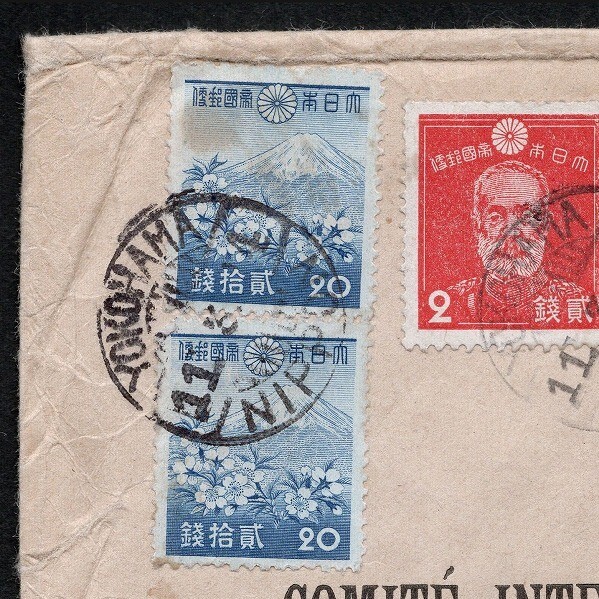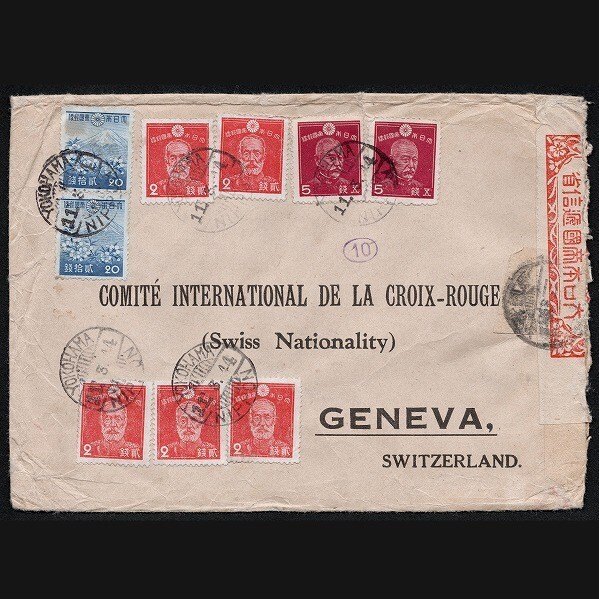 1944年3月11日/YOKOHAMA/NIPPON 赤十字国際委員会の駐日代表から、スイスの赤十字本部への差し出し。 日本郵便印ハンドブックによると、YOKOHAMA/NIPPONの最新データは1941年9月18日。 料金60銭は、別配達扱いか、4倍重量の加貼か、戦中の例外的な料金体系か? 封筒には裂けとシワが複数あります。20銭切手に汚れあり。 その他、多少の傷みや汚れはあります。画像をご確認の上、入札ください。 |