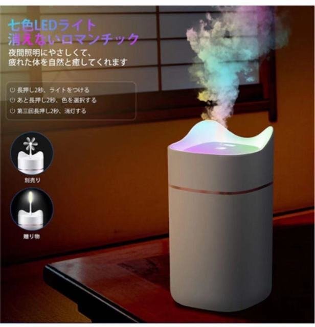 【七色LEDライト】 7色のグラデーションで変化するLEDライトを搭載しており卓上な加湿 器で、夜間照明にやさしい光は疲れた体を自然と癒してくれます。 人気な加湿器は実用性があります。常夜灯の代わりランプが優しく、仕事や就寝に、落ち着く雰囲気を演出してくれます。 ボタンを2秒間長押しして常夜灯をオンにし、もう一度ボタンを2秒間長押しすると、常夜灯の色が固定され、3回目のボタンを2秒間長押しして常夜灯をオフにします。