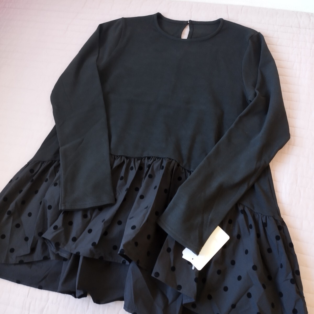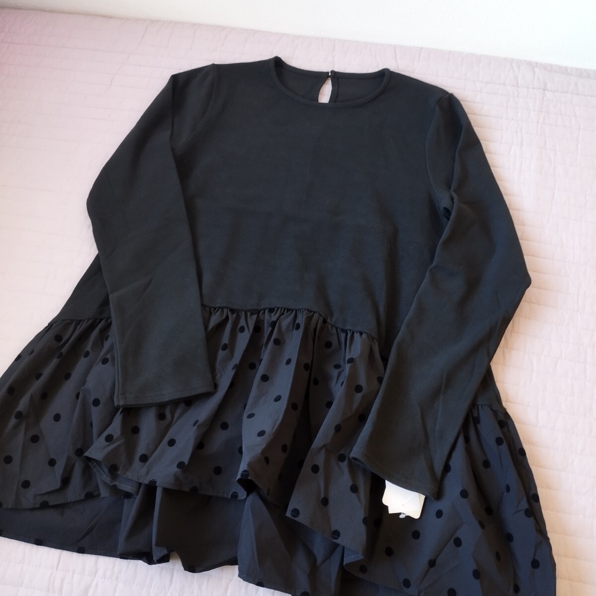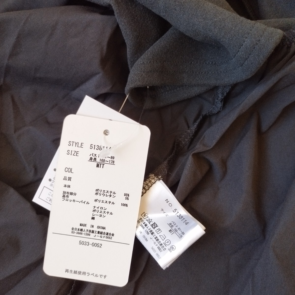 1点のみ 未使用 暖か 起毛感 ロング丈 カットソー Tシャツ M トール 手洗 黒 レイヤード風 異素材使用 裾フロッキードット 匿名 送料無料