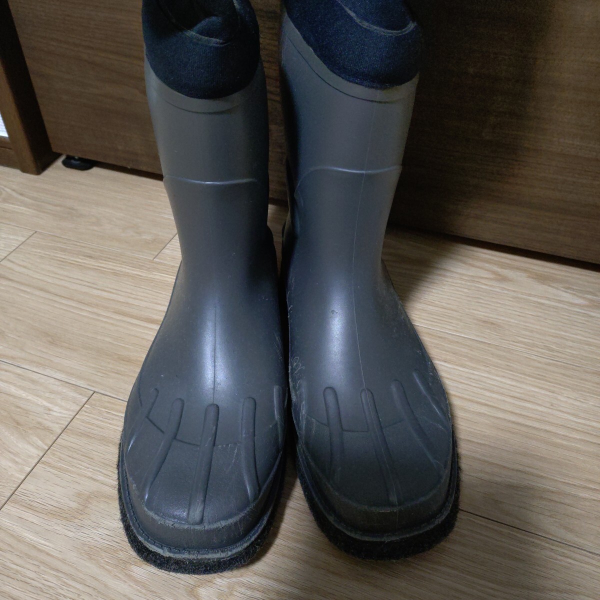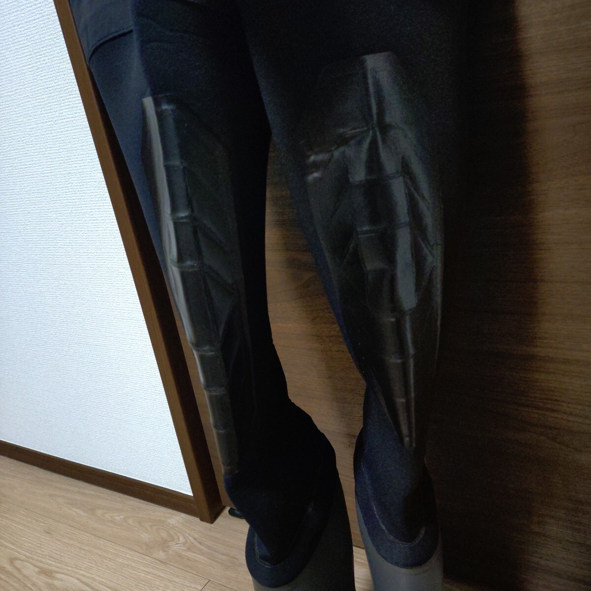 主に河川で使用していました。年式の割にはきれいな外観だと思いますが、ブーツ部分にはそれなりの傷がありますが、ひび割れはないです。膝のプロテクター部分はひび割れありですが、これも目立つものではないです。クロロプレン結合部分の浸水はありません。