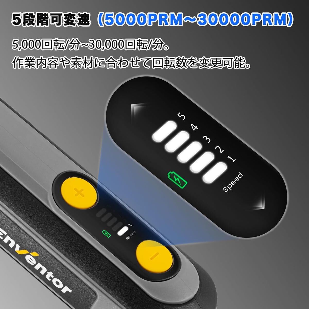 【5段変速可能】ミニルーター本体付属のボタンを押すだけで回転数を5000-30000rpmの5段階に調整が可能で、作業内容や材料によって最適なトルクを設定できます。