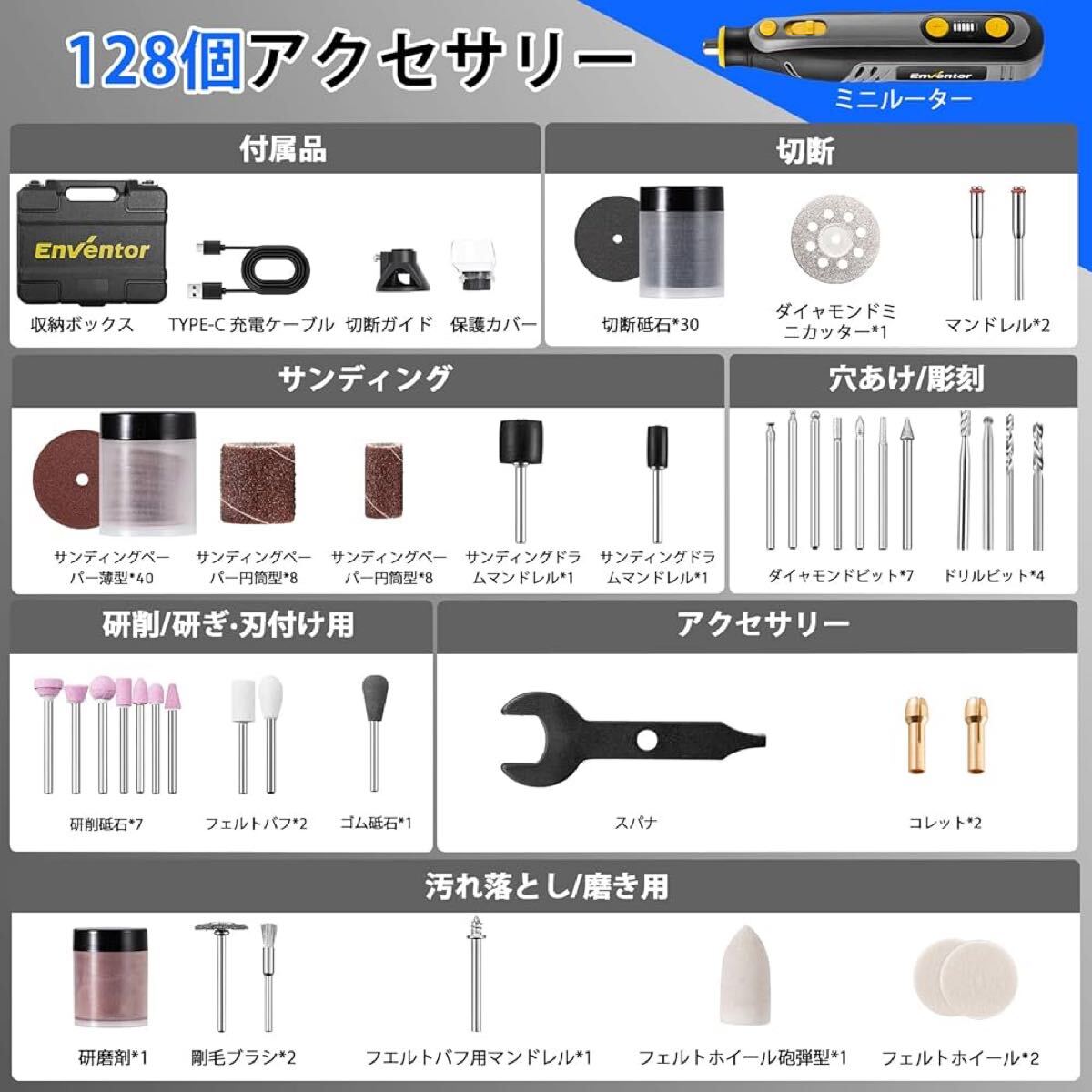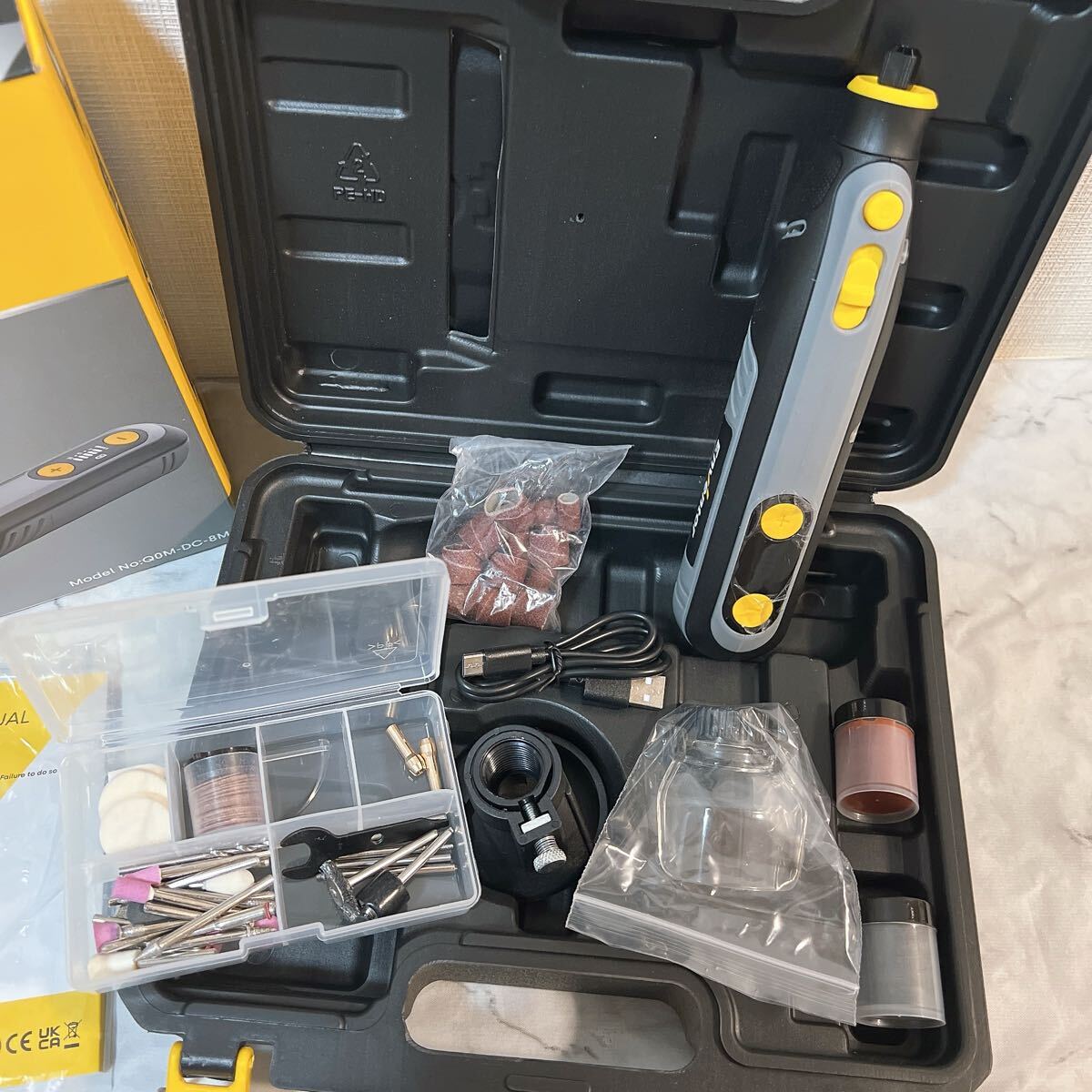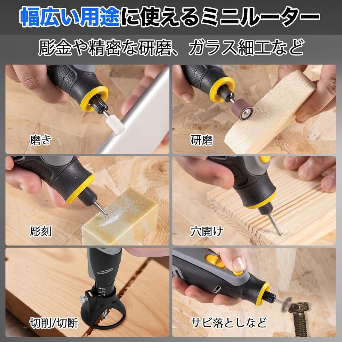 【様々な用途】:先端に様々なビットを取り付けて、回転させることで色々な用途に使えるリューターです。彫刻や研磨・切断・切削・磨きなどを行うことができ、小型軽作業のDIYに大活躍!該当する材料:金属、木材、プラスチック、粘土、宝石、アルミニウムなどのモデリング。