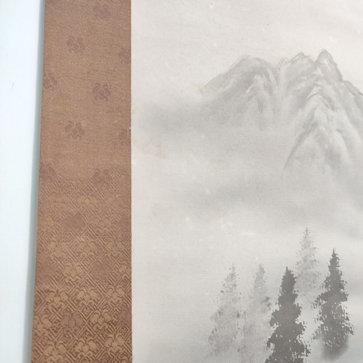 雄大な山並みと渓流、松林や家屋が描かれており、伝統的な和の雰囲気を感じられる一幅となっております。