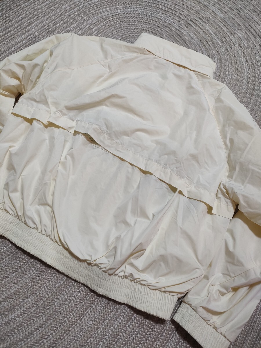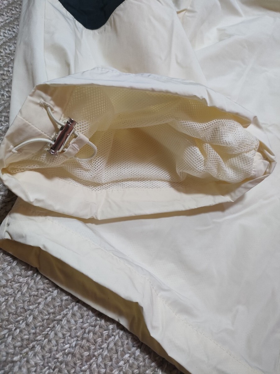 トップスはやや短丈のルーズシルエットになり、ジップで収納されたフードが付きます。