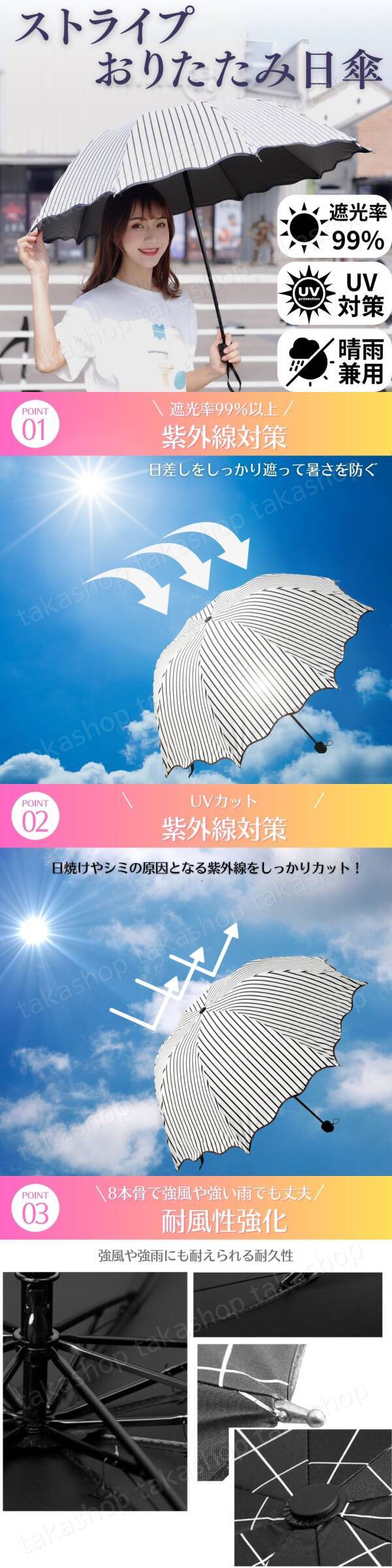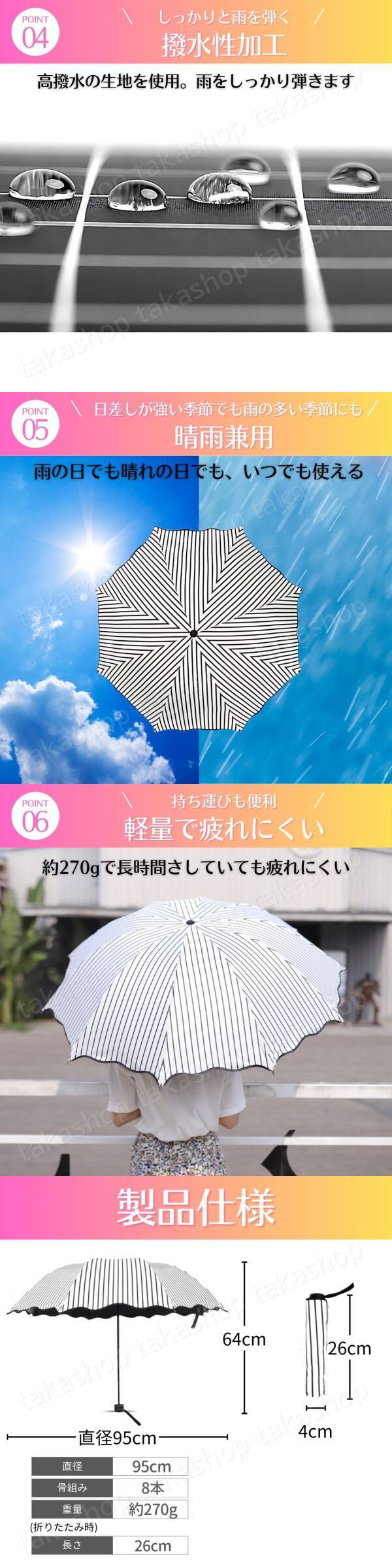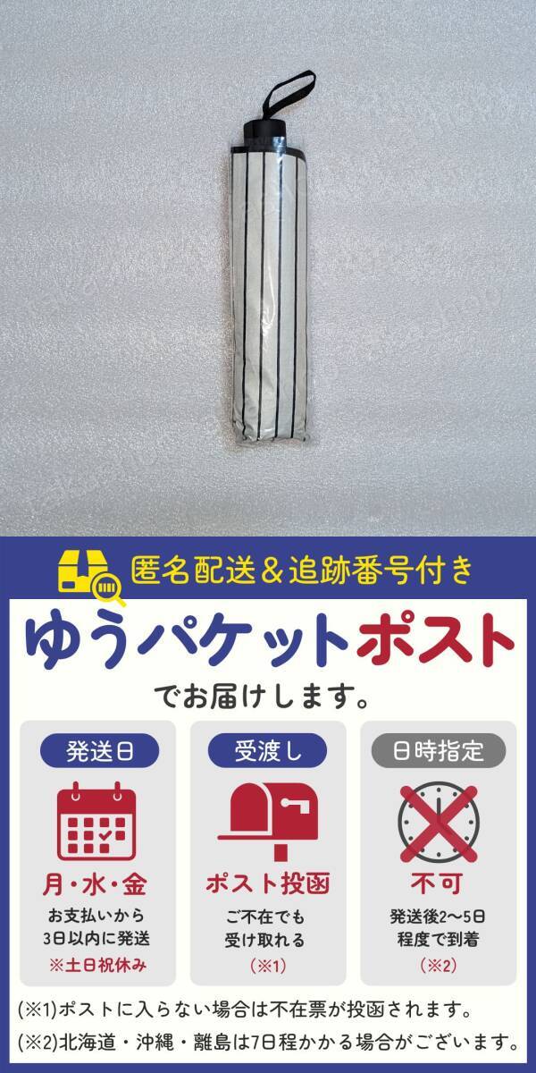 | 商品説明 | ご覧いただきありがとうございます! ●商品説明 白黒のストライプ柄がオシャレな折りたたみ傘です。 遮光率99%、UVカットに撥水加工もされている晴雨兼用することができます。 約270gで軽量な折りたたみ傘なので通勤・通学のバックの中に入れておいても持ち運びは楽にできます。 ●商品特徴 1.遮光率99%以上 日差しをしっかり遮って暑さを防いでくれます。 2.UVカット 日焼けやシミの原因となる紫外線をしっかりカットします。 3.耐風性強化 8本骨で強風や強雨にも耐えられる耐久性があります。 4.撥水性加工 高撥水の生地を使用しているので雨をしっかり弾きます。 5.晴雨兼用 雨の日でも晴れの日でもいつでも使えるのでこれ1本持っておけば大丈夫 6.軽量で疲れにくい 約270なので長時間さしていても疲れにくいです。 ●商品詳細 サイズ:(折りたたみ収納時)26cm (開いたとき)直径95cm カラー:白地に黒のストライプ(裏地:黒) 材質 :高機能ポリエステル 重量 :約270g ●発送について 【ゆうパケットポストで発送します】 発送日 :お支払い後1〜3日以内(平日) 到着目安:発送後2〜4日程度 ※商品はポストに投函されます ※遠方の方はもう少しかかる場合もございます 【配送方法の変更はできません】 ●お願い ・商品画像の転載や説明文のコピーはお止め下さい ※見つけたら通報しています ・ 海外製品のため、細かな汚れや傷がある場合があります。また、画像と実物の色合いが異なる場合がございますので、予めご了承ください ・ 即購入OK ・ コメントなしOK 〇初期不良は対応しますので、何かあれば「評価前に」ご連絡下さい |