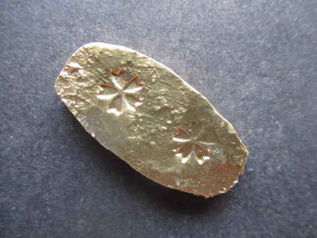 土佐金判は坂本龍馬によって考案され、海援隊が普及がさせたと伝えられています。表には桜花が、裏には菊花が散らされ、「土佐春秋金」の異名の源にもなっています。「土」の刻印も認められます。ご先祖が瀬戸内の海運に従事していた方から譲り受けました。傷や汚れなど状態についての詳細情報は画像でご確認ください。撮影の際の光の量によって実物と違った色に映ることがあります。これまで一度も鑑定に出したことがなく、正真正銘の真贋不明ですが、トラブル防止のためあえてレプリカとして出品させていただきます。また、金品位を記載した保証書が見当たらないとのことですので、非金製品として出品させていただきます。開始価格は買い値の10分の1以下とさせていただきますので「レプリカ・非金製品」を前提に無理のない範囲でご入札ください。寛永通寳は商品に含まれません。高騰防止のため即決価格をご用意しました。自己紹介欄にオークション休業日を記載させていただいております。お手数とは存じますが、ご入札前にお読みいただければ幸いです。よろしくお願い申し上げます。