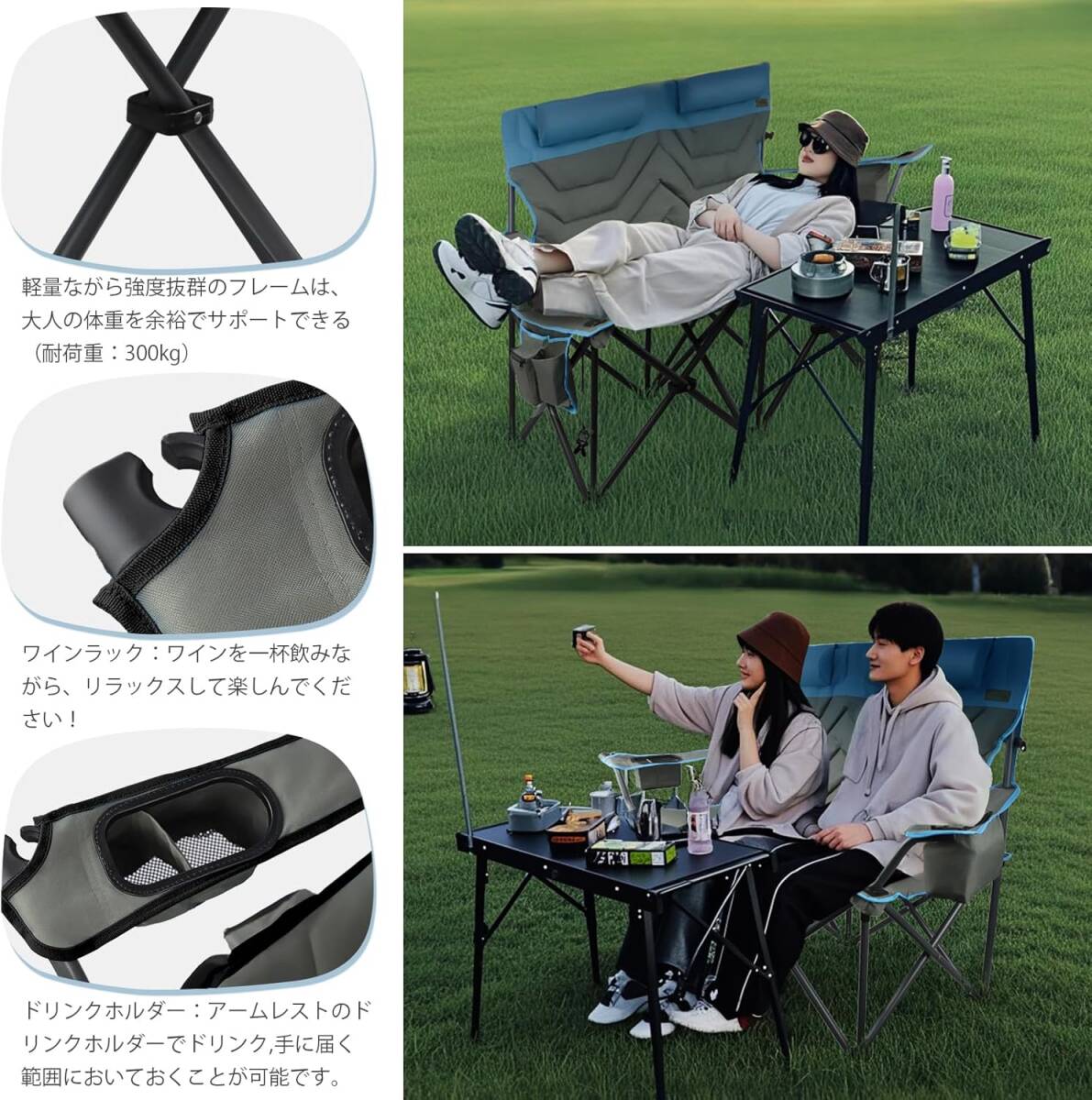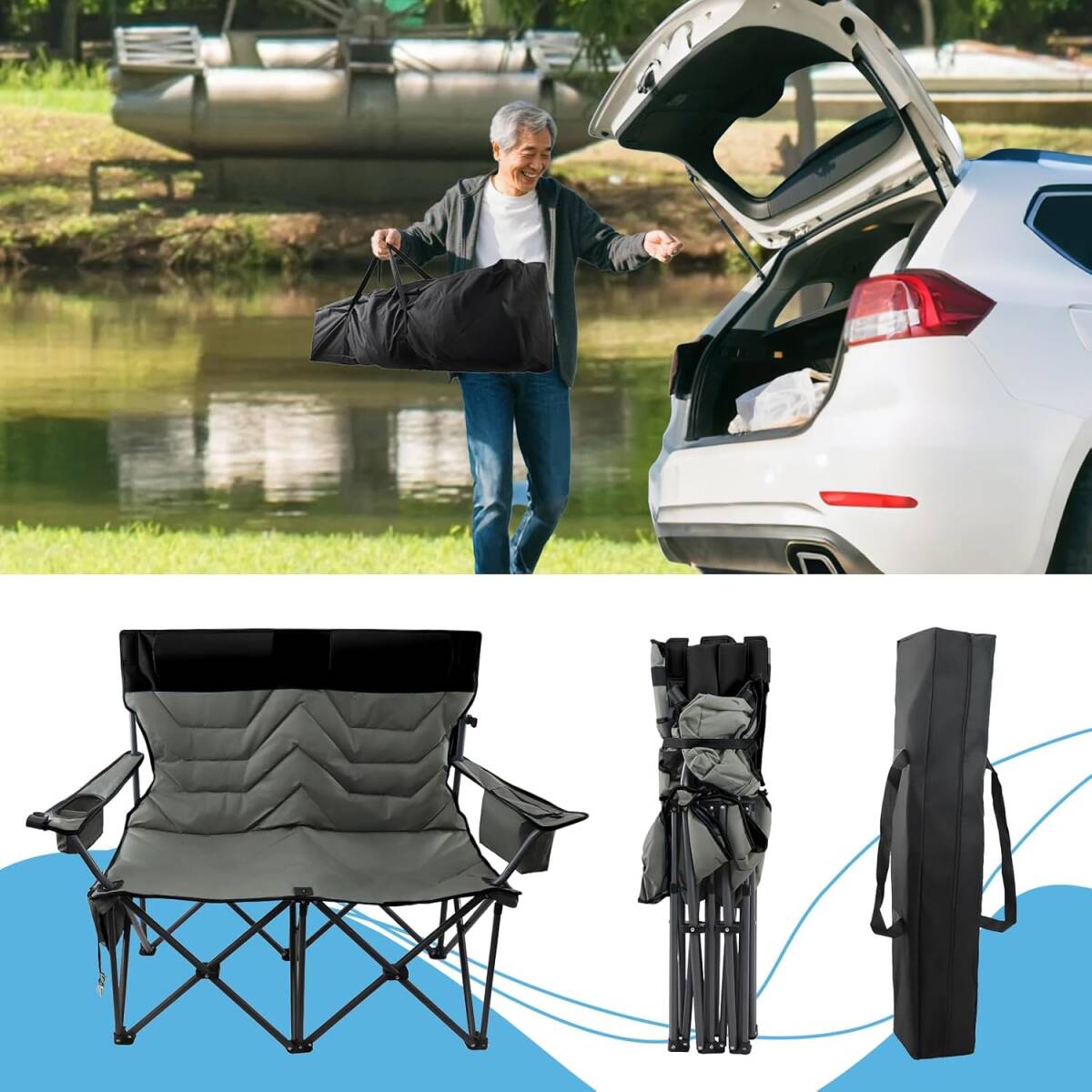 キャンプ 椅子 2人掛け アウトドアチェア 折りたたみ コンパクト 携帯便利 カップホルダー&クーラーボックス 耐荷重300kg Gray+Black