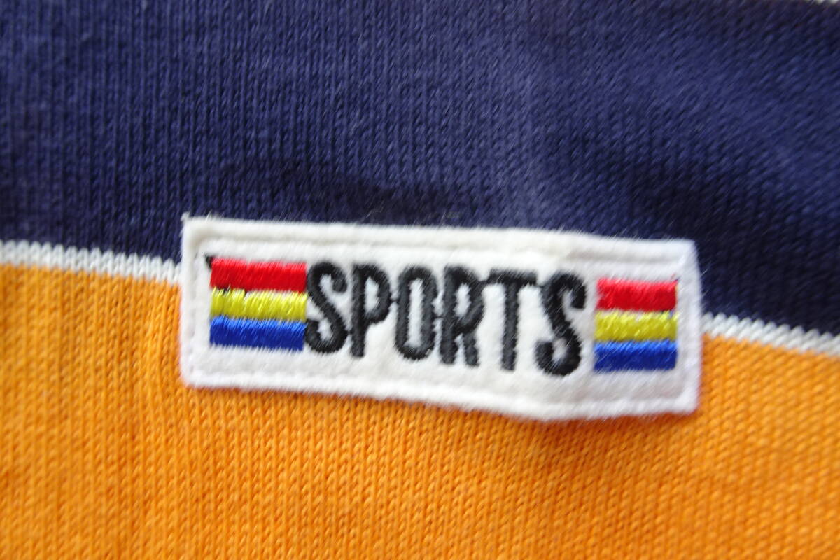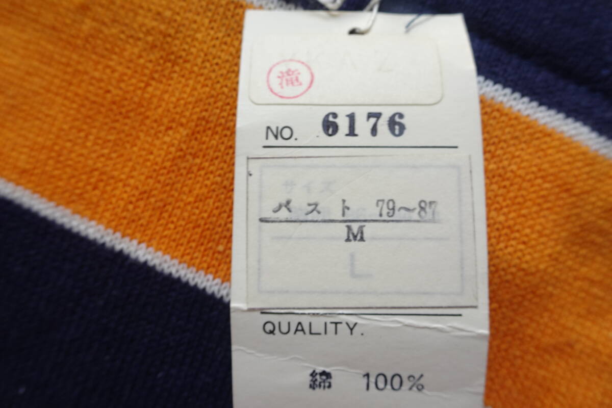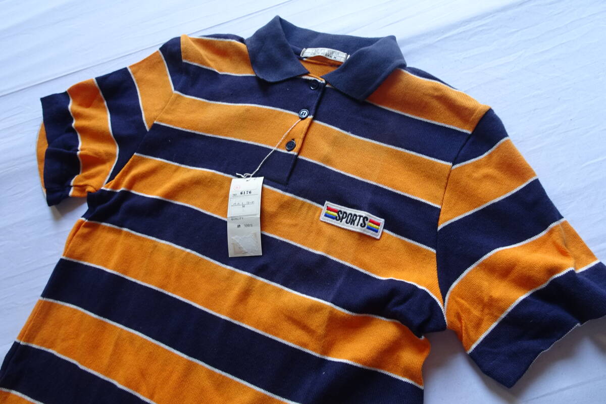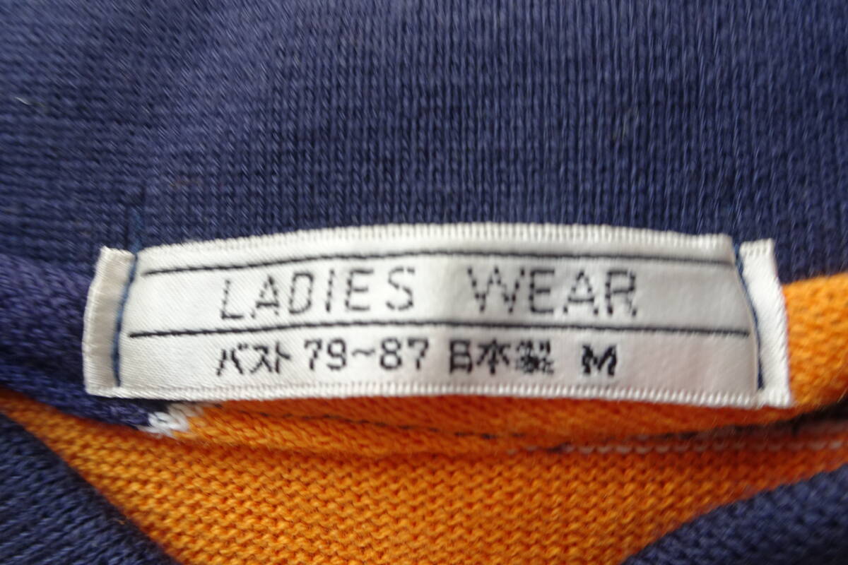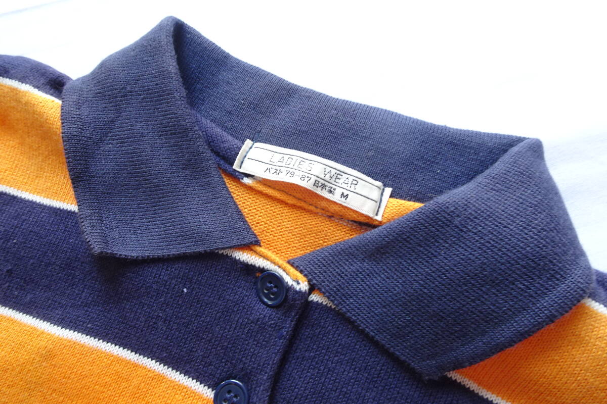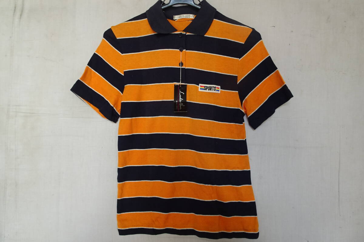 LADIES WEAR/半袖ポロシャツ/綿ニット系素材/極太ボーダー柄/フェルトワッペン/スポーツカジュアル/紺/ネイビー/オレンジ/Mサイズ(8/18R7)