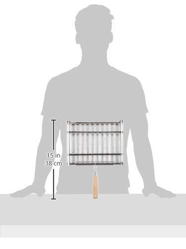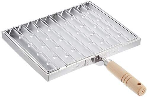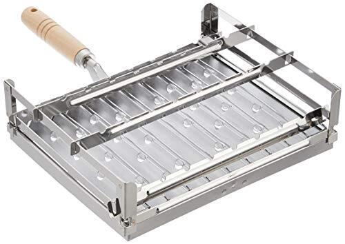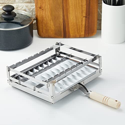 説明 商品紹介 - より ●はしが入れ易い・裏表を反しやすい「アコーディオン形状」を採用 ●火に油が落ちないので煙が出にくい設計 ●強火の近火・遠火のスタンド式 ●木柄取手式