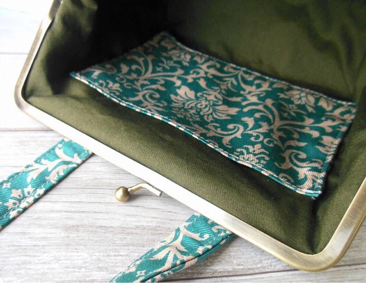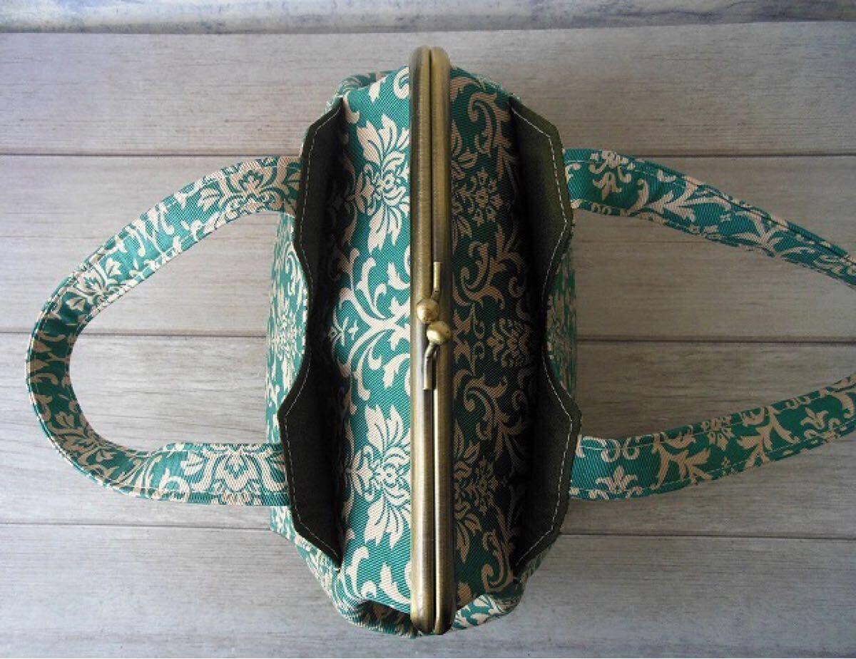 ◆がま口ポーチ◆あおりバッグ風◆ダマスク柄 ブルーグリーン◆ハンドメイド 化粧ポーチ 口金16.5㎝