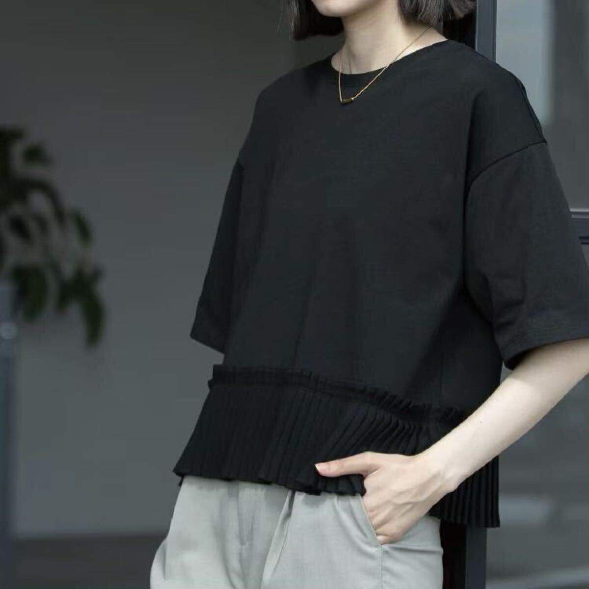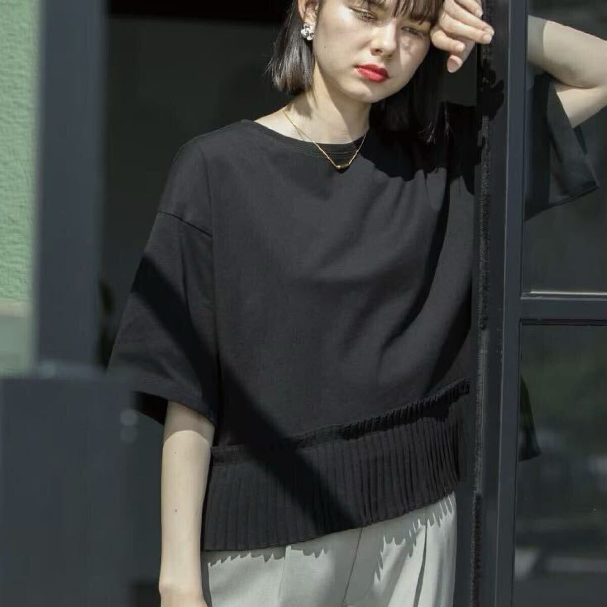 ・シンプルなカットソートップスの裾に、ブラウス素材のプリーツデザインをドッキング。