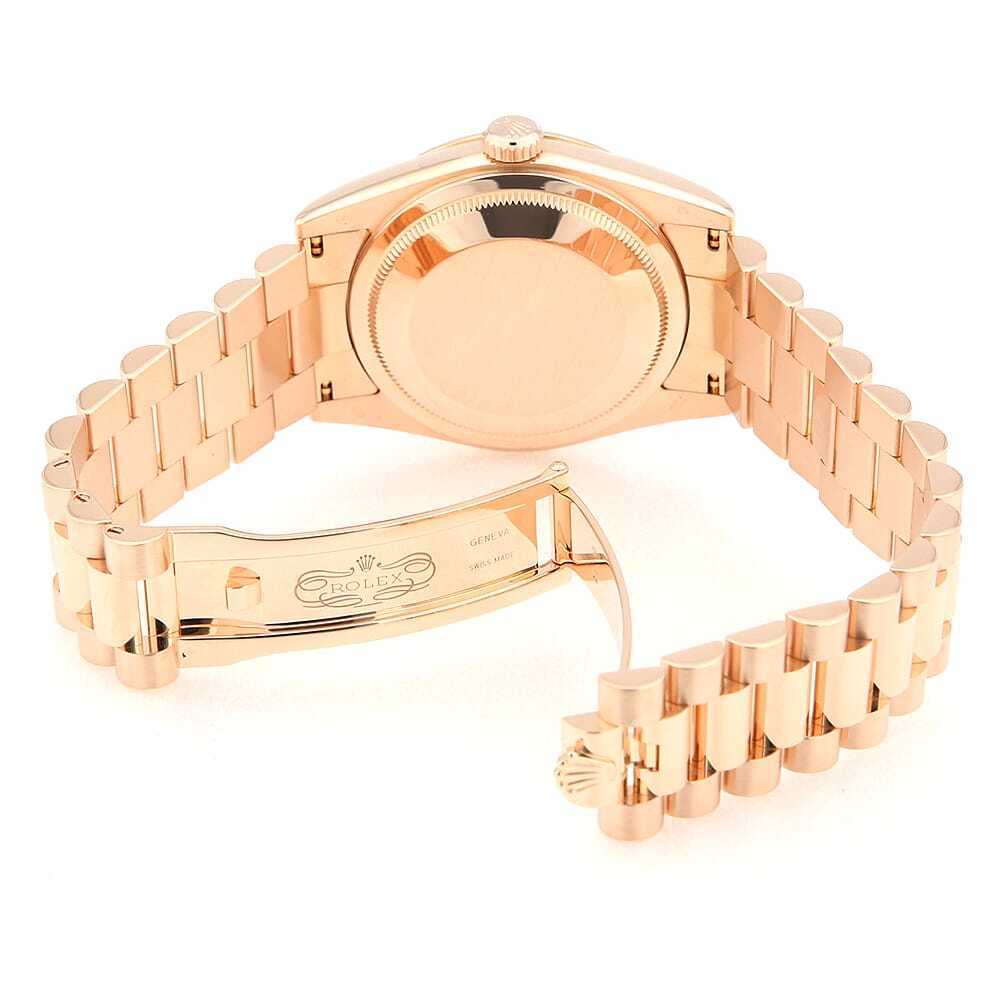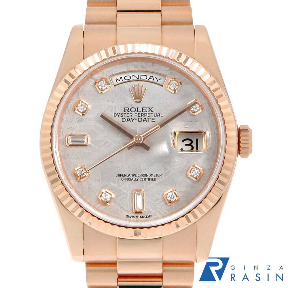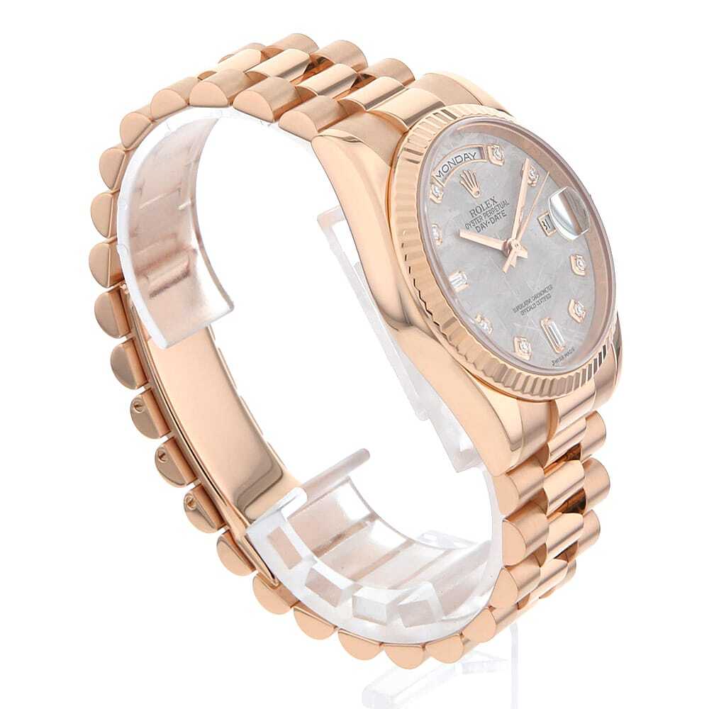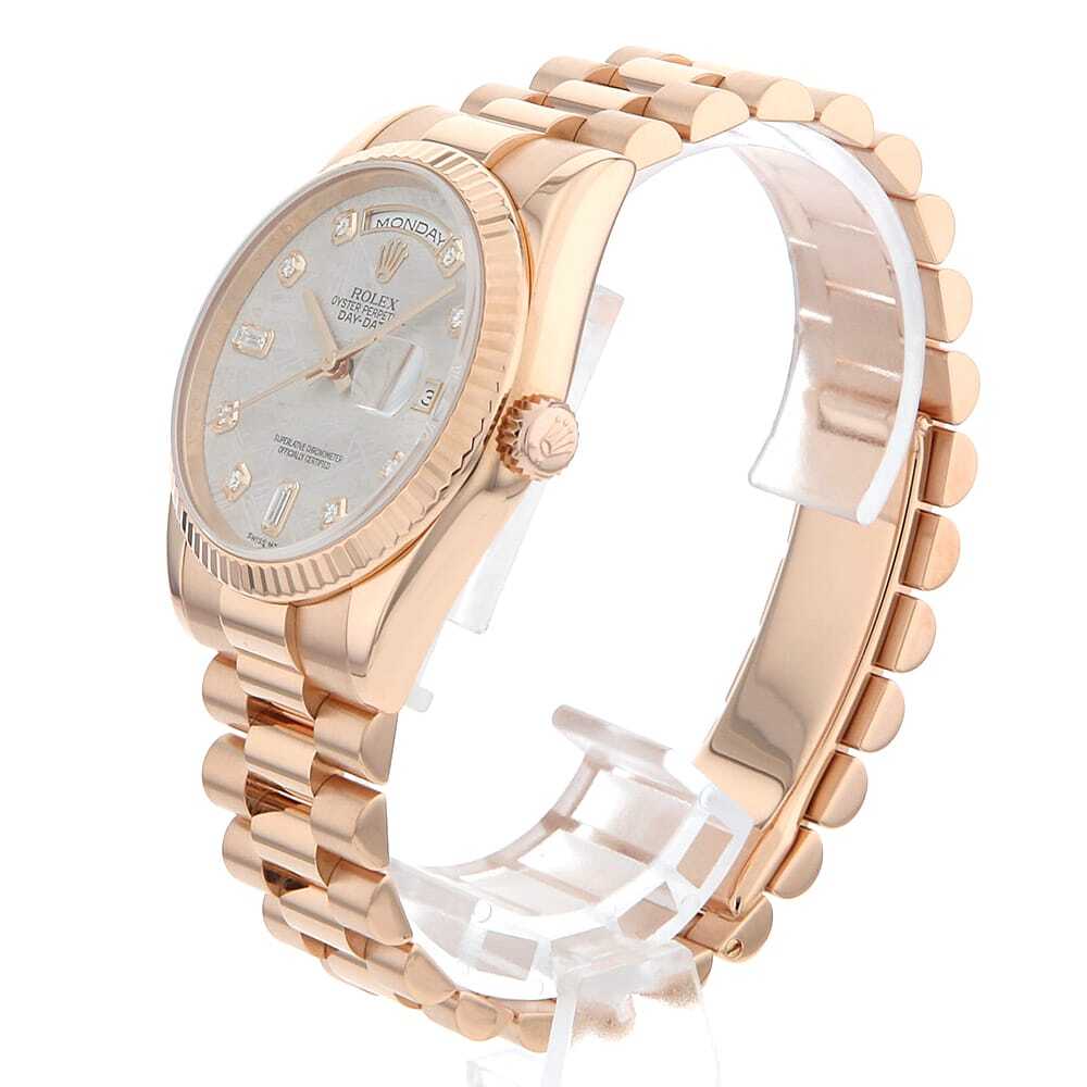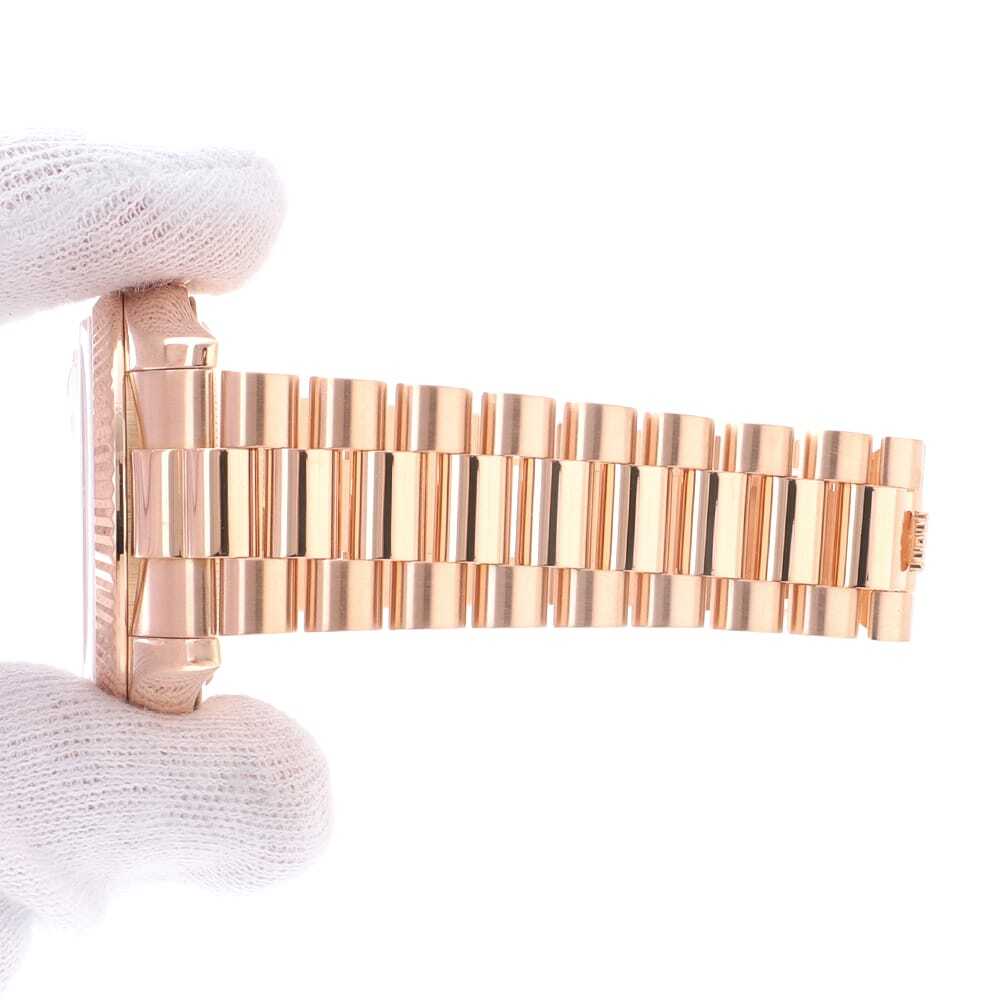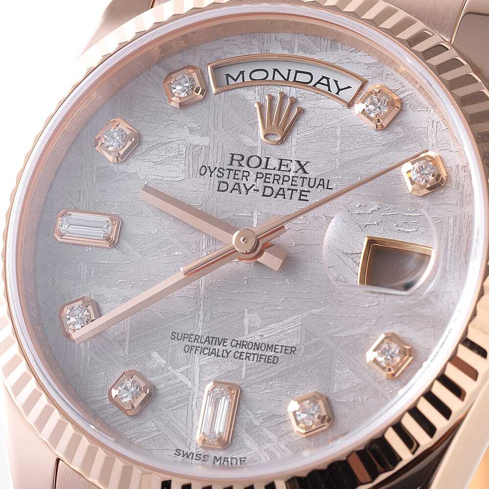 モデル情報 | ロレックスの最上級ラインとして1956年に誕生以来、最高級の素材と質感に拘ったハイクラスシリーズデイデイト。もともとデイデイトは曜日・日付表示機能が付いたカレンダーのことを指しますが、ロレックスはこのデイデイト機能を搭載したモデルに『高級素材』のみを採用することで、成功者が持つ時計としてのステータス性を確立しました。 |
