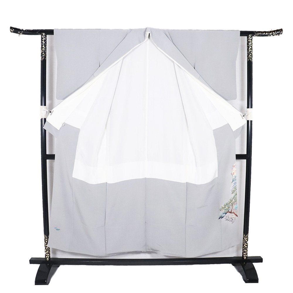 | 本加賀友禅 前川哲氏作 色留袖 袷 濱縮緬地 薄グレー(銀鼠色)暈し地 松竹梅・荒波 158 広襟 三つ紋 作家落款入り 内襟付き | |